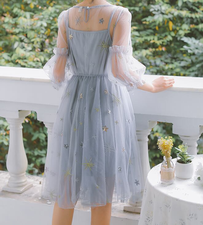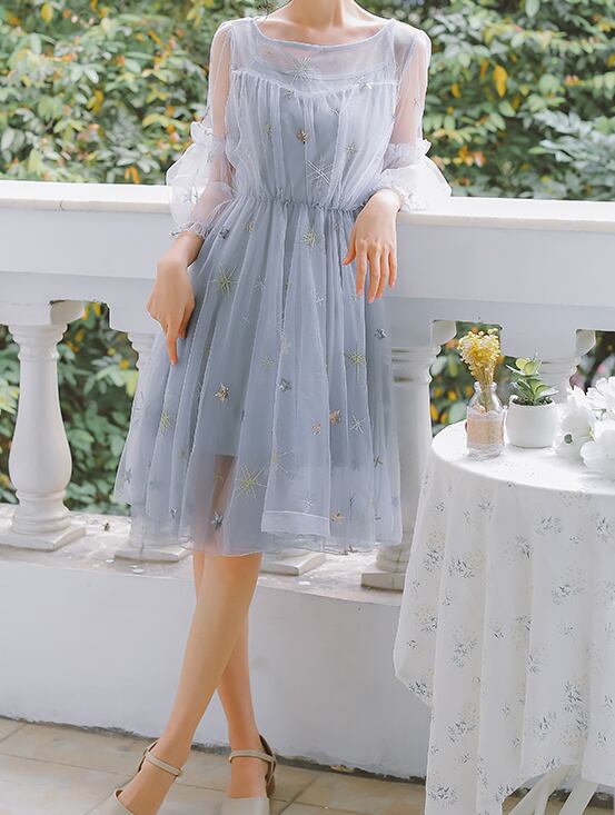 ドレス ワンピース パーティードレス フレアドレス Aラインドレス ワンピースドレス ショート ショート丈 膝丈 ひざ丈 袖あり 7分丈袖 チュール フレア ライン タイト スリム 細身 レース 刺繍 ハイウエスト 透け感 胸元 エレガント かわいい 大人可愛い きれいめ シンプル ゴージャス 華やか 上品 おしゃれ お洒落 セクシー スタイリッシュ 20代 30代 40代 レディース 二の腕カバー 送料無料 サイズ S M L 3色展開 ホワイト ブルー ピンク