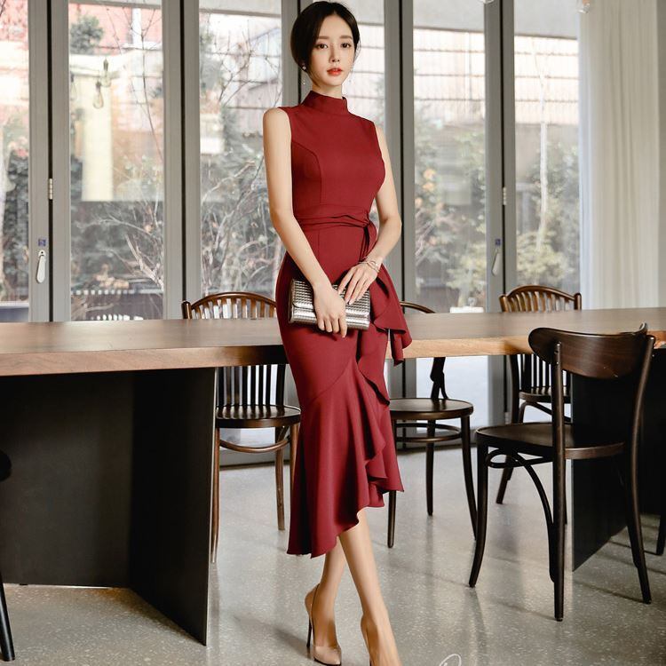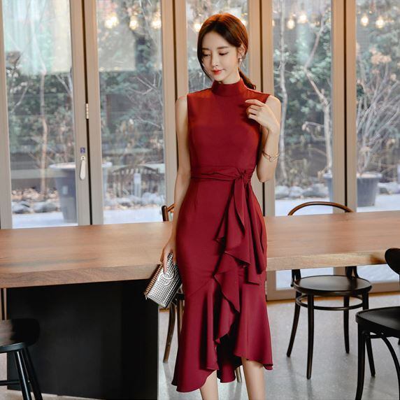 ドレス ワンピース レディース パーティドレス 結婚式ドレス ミモレ丈 タートルネック ノースリーブ 無地 タイト フィッシュテール ウエストマーク フリル ウエストリボン スリム 細身 スタイリッシュ マーメイド 着痩せ 体型カバー 大人可愛い フォーマル セクシー フェミニン きちんと感 きれいめ シンプル 大きいサイズ 上品 韓国 春 夏 秋 冬 オールシーズン シーズンレス 送料無料 結婚式 お呼ばれ 演奏会 パーティー 黒 ブラック 赤 レッド S M L XL 20代 30代 40代