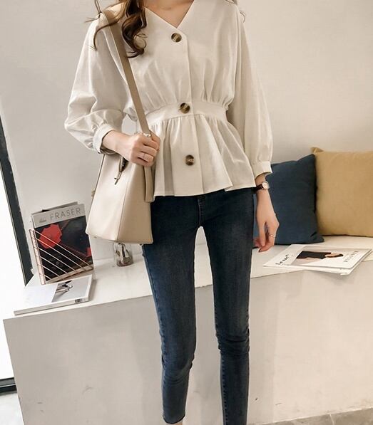 トップス ブラウス 長袖 Vネック 前ボタン ボタン付き ペプラム 裾ペプラム ウエストマーク かわいい 大人可愛い きれいめ シンプル カジュアル 大人 上品 おしゃれ お洒落 こなれ感 大人可愛い 大人女子 スイート フェミニン フェミニンスタイル 無地 春 秋 20代 30代 レディース ビジネス OL 通勤 学生 通学 デート ナチュラル ベーシック モテ オン オフ デイリー使い デイリー 着回し 送料無料 女っぽ 大人っぽ 白 ホワイト 黒 ブラック 緑 カーキ グリーン