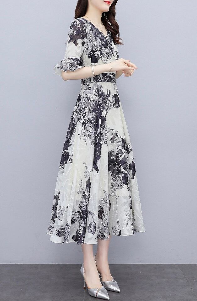 レディース ワンピース ロングワンピース フレア ハイウエスト 花柄 華やか ゴージャス エレガント Vネック 5分袖 夏 大人かっこいい 大人可愛い 大人女子 こなれ感 フェミニン お洒落 モデル 美スタイル 美人 脚長効果 20代 30代 40代 M L XL 2XL ホワイトブラック ホワイトレッド アイボリー OL 学生 大学生 キャバ嬢 女子会 飲み会 パーティ 食事会 モテコーデ モテファション デート リゾート 海外 海 旅行 コーデ オルチャンファション アラサー アラフォー 送料無料