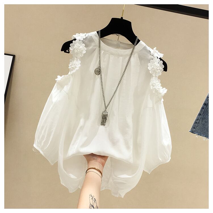 立体的な花のモチーフが可愛いシフォンシャツです。
