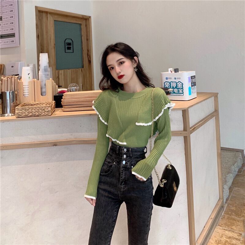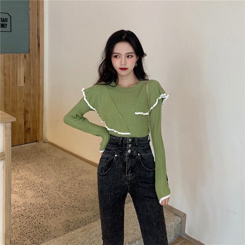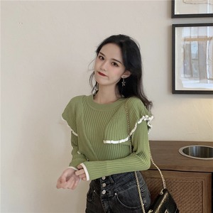 レディース ニット セーター 長袖 ラウンドネック 丸首 スリム フリル アシンメトリー アシメ バイカラー リブ トップス 秋 冬 ブラック 黒 グリーン 緑 2次会 こなれ感 カジュアル フェミニン エレガント ヘビロテ かわいい カジュアル 大人可愛い 可愛い 高見え シンプル おしゃれ お洒落 大人女子 ラブリー キュート ガーリー 10代 20代 30代 40代 オフィス ビジネス OL 通勤 学生 通学 デート お出かけ 女子会 休日 旅行 着回し 普段使い 流行 トレンド 送料無料