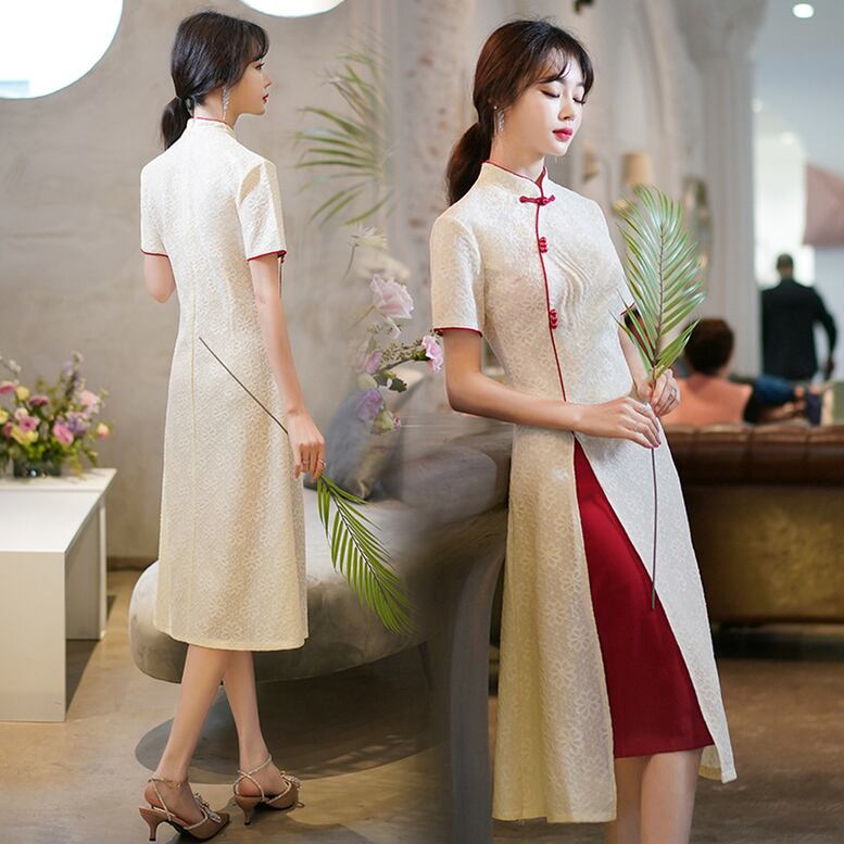 ドレス チャイナドレス レディース ワンピース チャイナ パーティドレス マオカラー 半袖 スタンドカラー 花柄 刺繍 バイカラー 重ね着風 ひざ下丈 アシンメトリー 斜めボタン スリット ベージュ 大人可愛い きれいめ 上品 レトロ アジアン ガーリー エレガント フォーマル フェミニン 春 夏 秋 冬 二次会 オールシーズン 謝恩会 結婚式 披露宴 セレモニー OL 学生 オフィス ビジネス デート お出かけ 女子会 パーティー イベント ゆったり 体型カバー 美脚 インスタ映え 送料無料
