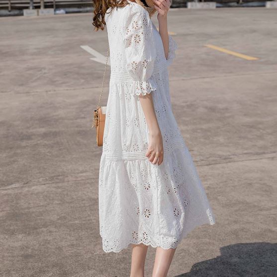 ワンピース レディース フレアワンピース 総レースワンピース レース 総レース 膝下 ミモレ丈 ラウンドネック 七分袖 プルオーバー フレア袖 無地 ベーシック トレンド ひらひら Aライン ゆったり 大きいサイズ カットワーク ティーアード フレア 体型カバー 着痩せ おしゃれ 大人 かわいい 大人可愛い カジュアル 清楚 フェミニン 上品 ガーリー 韓国 キュート 春 夏 秋 シーズンレス 送料無料 お出かけ デート 普段着 着回し 白 ホワイト 10代 20代 30代 S M L XL 2XL
