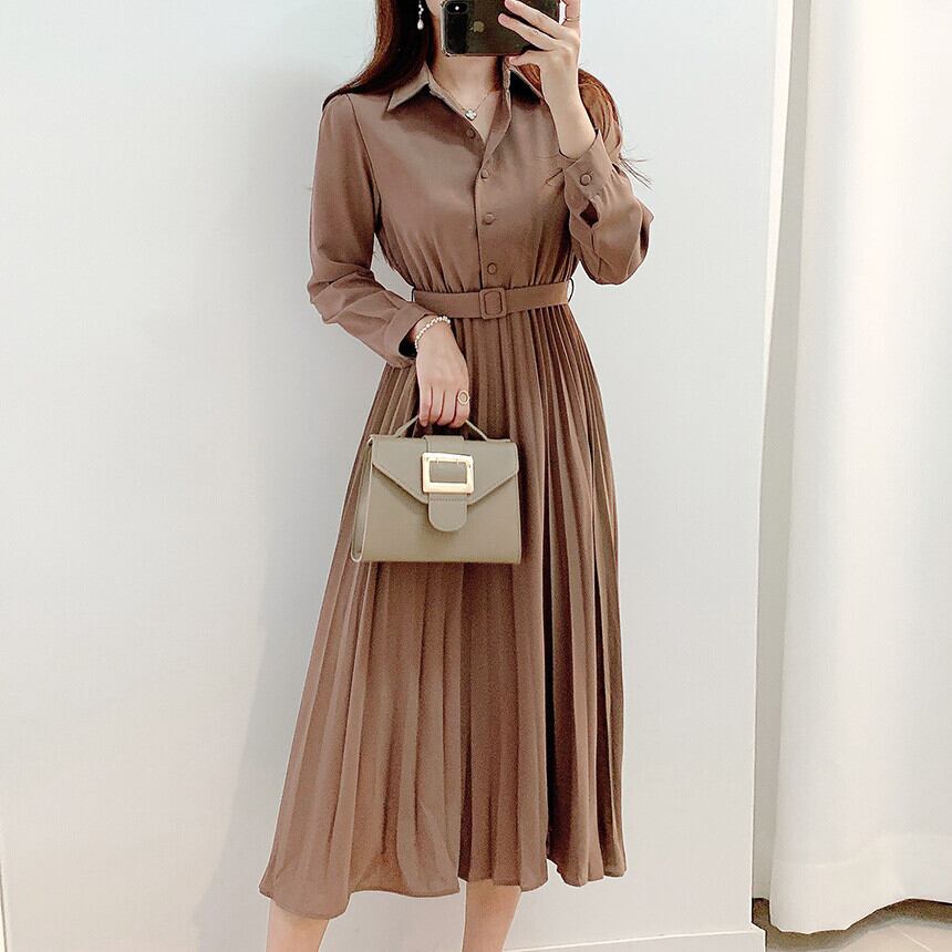 ワンピース レディース シャツワンピース フレアワンピース 膝丈 ひざ丈 膝下 ミモレ丈 プルオーバー 襟付き ポロカラー 長袖 無地 レトロ ハイウエスト ウエストマーク トレンド ベルト付き ひらひら Aライン ゆったり 大きいサイズ プリーツ フレア 体型カバー 着痩せ おしゃれ 大人 大人可愛い カジュアル 清楚 フェミニン 上品 韓国 きれいめ キュート 春 夏 秋 冬 送料無料 デート 普段着 着回し ブラウン ベージュ 10代 20代 30代 40代 S M L XL
