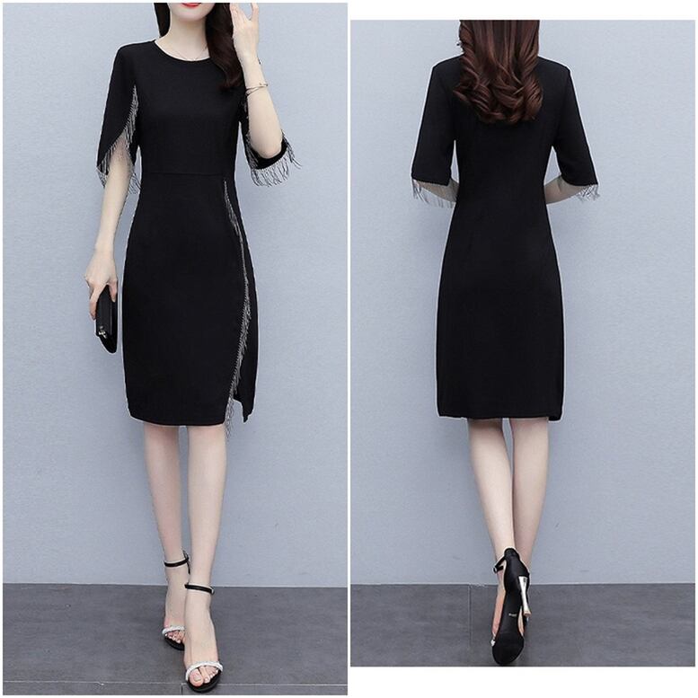 ワンピース レディース フリンジ切り替えワンピース ひざ丈 ミディアム タイト ドレス ラウンドネック 半袖 スリット アシンメトリー 黒 ブラック 大人可愛い きれいめ 上品 ガーリー エレガント フォーマル フェミニン 春 夏 秋 冬 二次会 オールシーズン 謝恩会 結婚式 披露宴 セレモニー OL 学生 オフィス ビジネス 通勤 通学 デート お出かけ 女子会 パーティー イベント 体型カバー 美脚 脚長 普段使い インスタ映え 送料無料