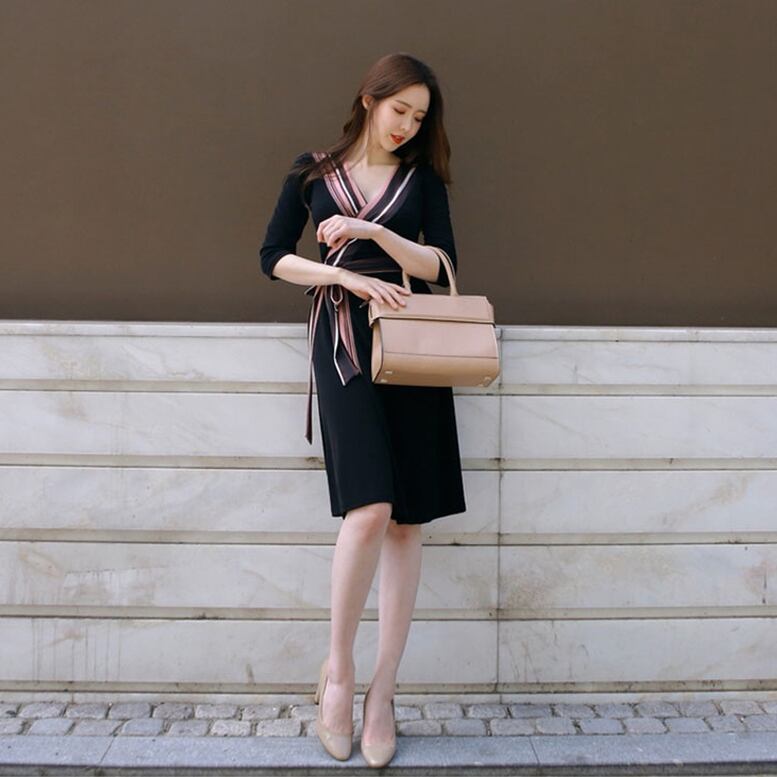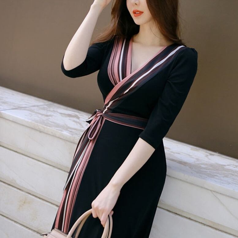 ワンピース レディース ラップワンピース カシュクール Vネック 7分袖 ひざ丈 ミディアム ドレス ウエストリボン 巻きスカート スリット ハイウエスト 黒 ブラック 大人可愛い きれいめ 上品 レトロ ルーズ ガーリー エレガント フォーマル フェミニン 春 夏 秋 冬 二次会 オールシーズン OL 学生 オフィス ビジネス 通勤 通学 デート お出かけ 女子会 パーティー イベント 体型カバー 美脚 トレンド インスタ映え 送料無料