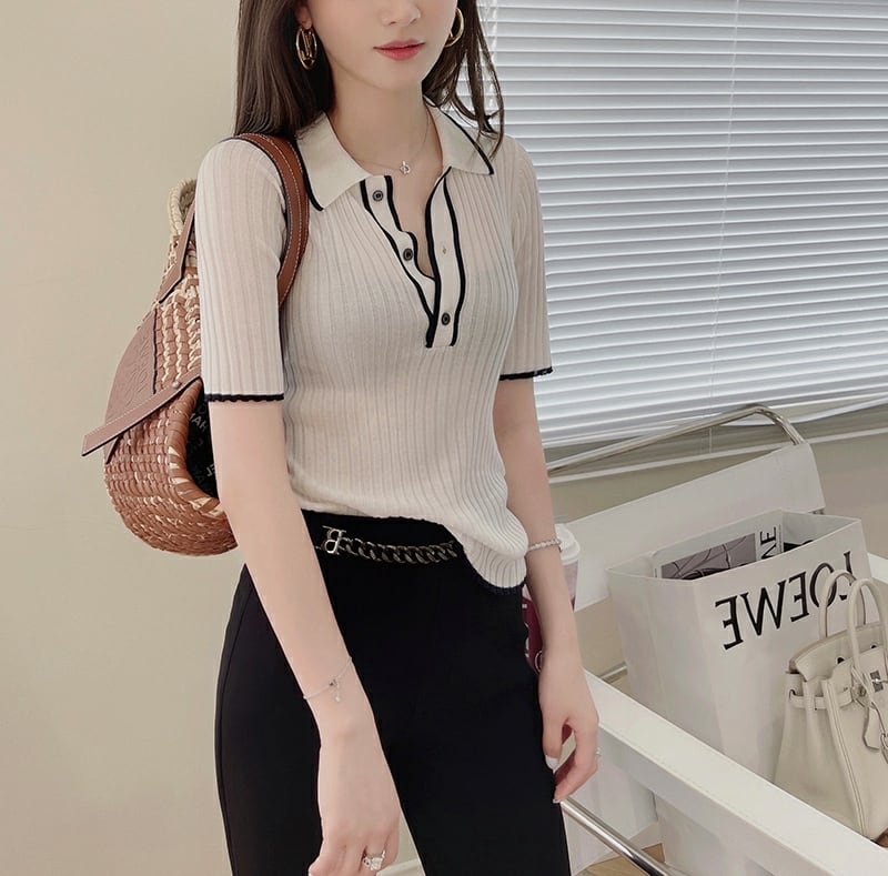 トップス レディース ニットソー プルオーバー 襟付き ニット リブニット サマーニット 袖あり 半袖 五分袖 襟付き レギュラーカラー ポロカラー 無地 配色 バイカラー レトロ ベーシック トレンド 大きいサイズ スマート 細身 スタイリッシュ 体型カバー 着痩せ 大人可愛い カジュアル フェミニン 韓国 シンプル キュート 春 夏 秋 シーズンレス 送料無料 お出かけ 通勤 オフィス デート 普段着 着回し 白 ホワイト 黒 ブラック S M L XL 10代 20代 30代 40代