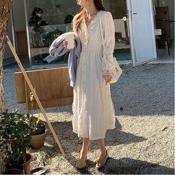 ワンピース レディース シャツワンピース フレアワンピース ロングワンピース 総レースワンピース シフォン レース 総レース ミモレ ミモレ丈 ロング ロング丈 Vネック 長袖 無地 ひらひら パールボタン シャーリング Aライン ゆったり 大きいサイズ フレア 刺繍 体型カバー 着痩せ シースルー 透け感 おしゃれ 大人 かわいい 大人可愛い 清楚 上品 ガーリー 韓国 春 夏 秋 冬 オールシーズン 送料無料 お出かけ デート 普段着 着回し ベージュ 10代 20代 30代 XS S M L XL