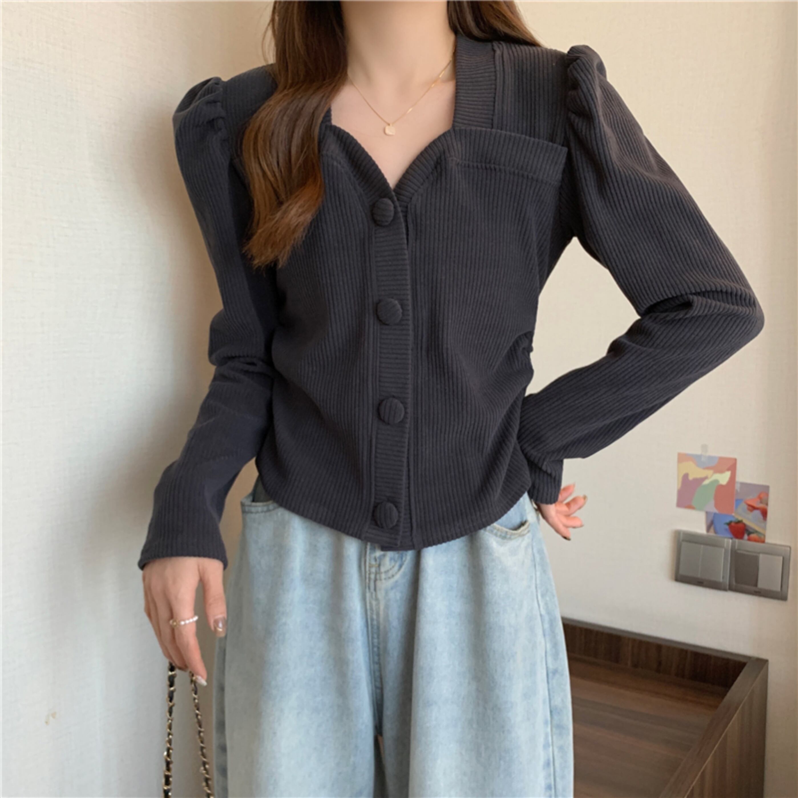 トップス シャツ カットソー 白トップス ショート丈 袖あり 長袖 パフスリーブ Vネック 襟なし タイト 細身 スリム ボタン ニット かわいい 大人可愛い シンプル カジュアル 大人 おしゃれ お洒落 大人女子 ラフ ラブリー キュート 甘アイテム 無地 夏 秋 10代 20代 30代 レディース オフィス ビジネス OL 通勤 学生 通学 デート お出かけ 休日 旅行 万能 着回し 普段使い 韓国 韓国系 送料無料 フリーサイズ 3色展開 白 ホワイト 黒 ブラック 茶色 ブラウン モノトーン