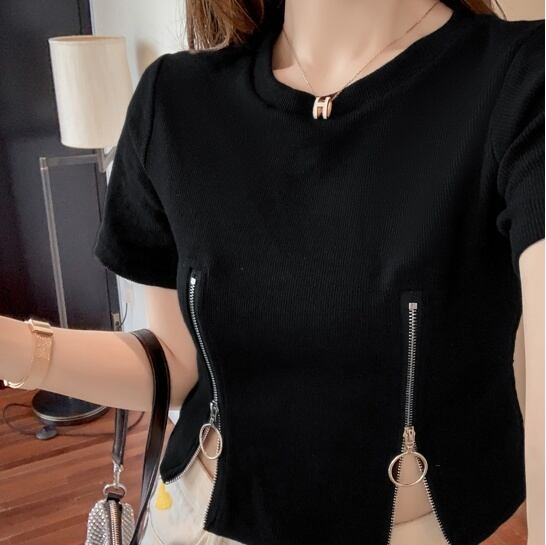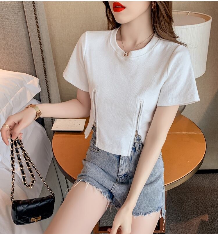 トップス Tシャツ カットソー 白トップス ショート ショート丈 袖あり 半袖 Uネック 襟なし スリム タイト 細身 スリット ハイウエスト ファスナー クロップド丈 大人可愛い カジュアル 大人 おしゃれ お洒落 かっこいい 大人女子 こなれ感 クール セクシー 無地 夏 10代 20代 30代 レディース ママ 学生 通学 デート お出かけ 休日 リゾート 旅行 海 着回し 普段使い 送料無料 海外ライク サイズ S M L XL 3色展開 白 ホワイト 黒 ブラック 青 ブルー ライトブルー