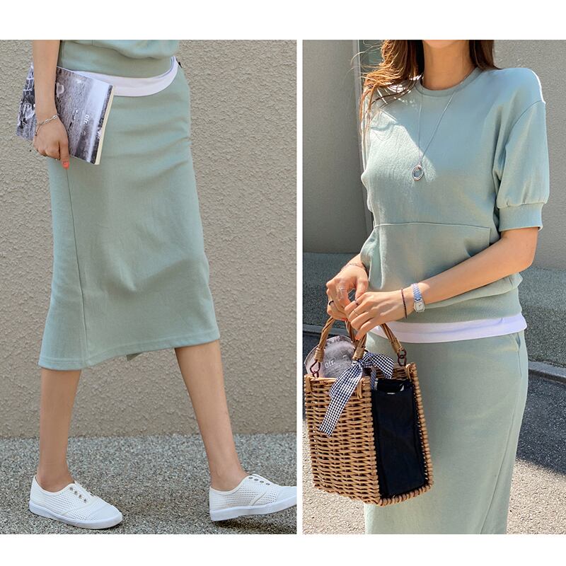 ニットトップス 半袖ニット ニットスカート セットアップ ひざ丈スカート ミドル丈スカート ひざ丈 ミドル丈 半袖 ラウンドネック クルーネック Uネック リブ付き レイヤード風 重ね着風 バックスリット スリット入り シンプル 無地 おしゃれ きれいめ きれい色 こなれ感 大人 大人カジュアル コットン ブラック ベージュ グリーン S M L XL 10代 20代 30代 黒 緑 お出かけ デート 着回し 普段使い デイリー 春 夏 秋 ママコーデ ママ 旅行 女子旅 お散歩 公園 送料無料