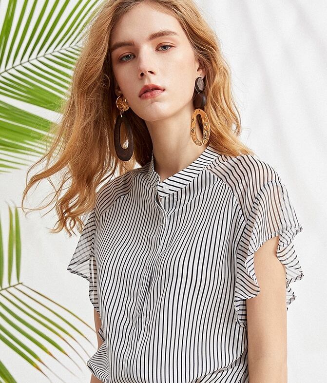 トップス ブラウス 袖あり 半袖 フレアスリーブ 襟付き スタンドカラー フレア シャツ シフォン 薄手 かわいい 大人可愛い きれいめ 大人 上品 おしゃれ お洒落 大人可愛い 大人女子 ラブリー キュート ガーリー クール セクシー エレガント スイート ストライプ 春 夏 秋 20代 30代 40代 レディース ママ ビジネス OL 通勤 学生 通学 デート オフィス お出かけ 公園デビュー ナチュラル オフィスカジュアル 着回し 普段使い コーデ スタイル 楽ちん モテ 送料無料