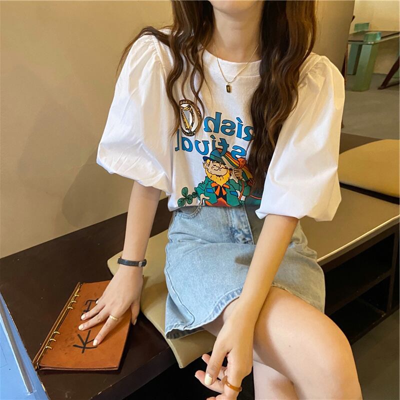 レディース トップス 半袖 Tシャツ パフスリーブ プリント レトロ ラウンドネック 夏 M L XL 2XL 大きいサイズ ラージサイズ ホワイト かわいい 可愛い 大人 大人っぽ 大人可愛い 大人女子 メンズライク ボーイッシュ スポーティー クール おしゃれ お洒落 女っぽ キュート ラブリー カジュアル ファッション コーデ 個性的 モテ ラフ ゆったり ルーズ 体型カバー 着回し 普段使い お出かけ ランチ ショッピング 女子会 デート 旅行 休日 イベント スポーツ 海 アウトドア 送料無料
