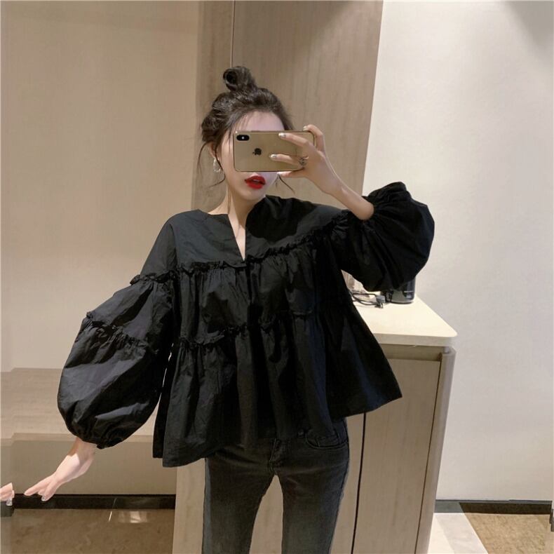 トップス レディース シャツ ブラウス プルオーバー ティーアード ショート丈 袖あり 長袖 ノーカラー キーネック ボリューム袖 バルーンスリーブ ぽわん袖 無地 トレンド ゆったり ビッグシルエット 大きいサイズ オーバーサイズ 大きめ フレア 体型カバー 着痩せ 薄手 大人可愛い かわいい カジュアル フェミニン ガーリー 韓国 エレガント キュート おしゃれ お洒落 春 秋 送料無料 お出かけ デート 女子会 学生 普段着 着回し 黒 ブラック フリーサイズ 10代 20代 30代 40代