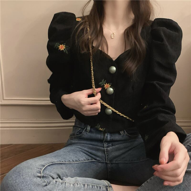 トップス レディース シャツ ブラウス コーデュロイ ショート丈 クロップド 袖あり 長袖 スクエアネック パフスリーブ ぽわん袖 花柄 フローラル レトロ トレンド フロントボタン スマート 細身 スタイリッシュ 刺繍 へそ出し 体型カバー 着痩せ 花刺繍 大人可愛い かわいい カジュアル フェミニン ガーリー 韓国 キュート おしゃれ お洒落 春 秋 冬 シーズンレス 送料無料 お出かけ デート 女子会 普段着 デイリー 着回し ブラック ベージュ S M L 10代 20代 30代 40代