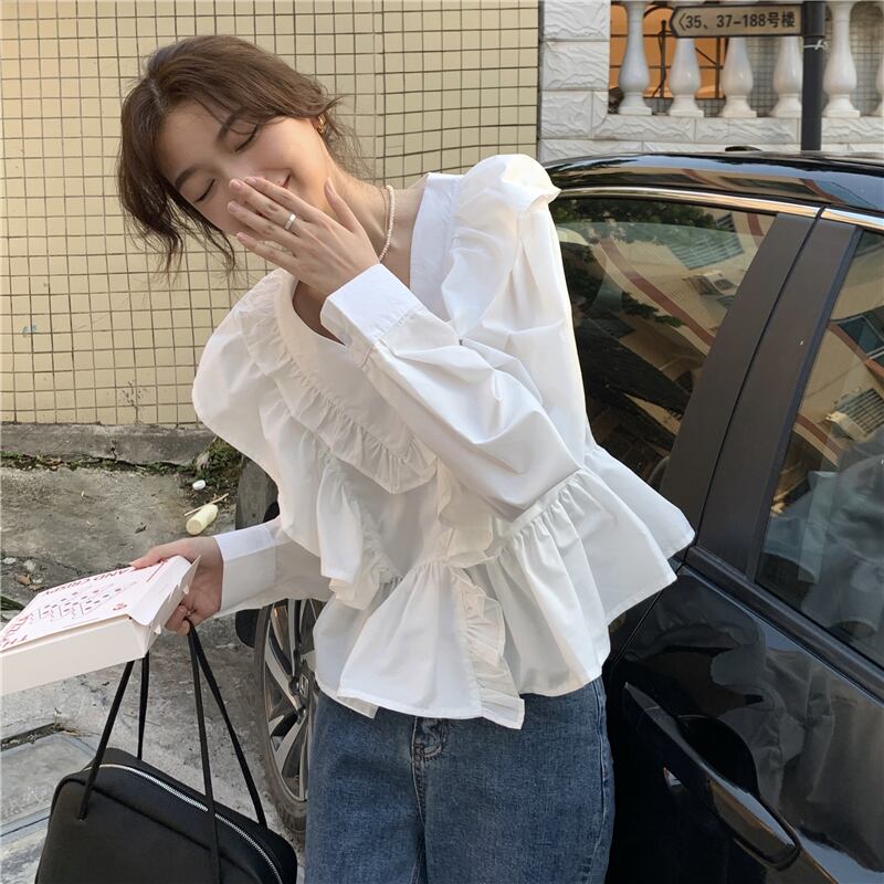 トップス シャツ ホワイトシャツ 白シャツ レディース フリル Vネック 長袖 10代 20代 30代 ホワイト かわいい 可愛い 大人 大人っぽ 大人可愛い 大人女子 おしゃれ お洒落 女っぽ きれいめ 上品 清楚 フェミニン ガーリー キュート スイート 無地 シンプル カジュアル ファッション スタイル コーデ トレンド 普段着 普段使い ラフ ルーズ 楽ちん 体型カバー 落ち感 抜け感 こなれ感 個性的 通勤 OL 通学 学生 お出かけ ランチ ショッピング 女子会 デート 旅行 休日 送料無料