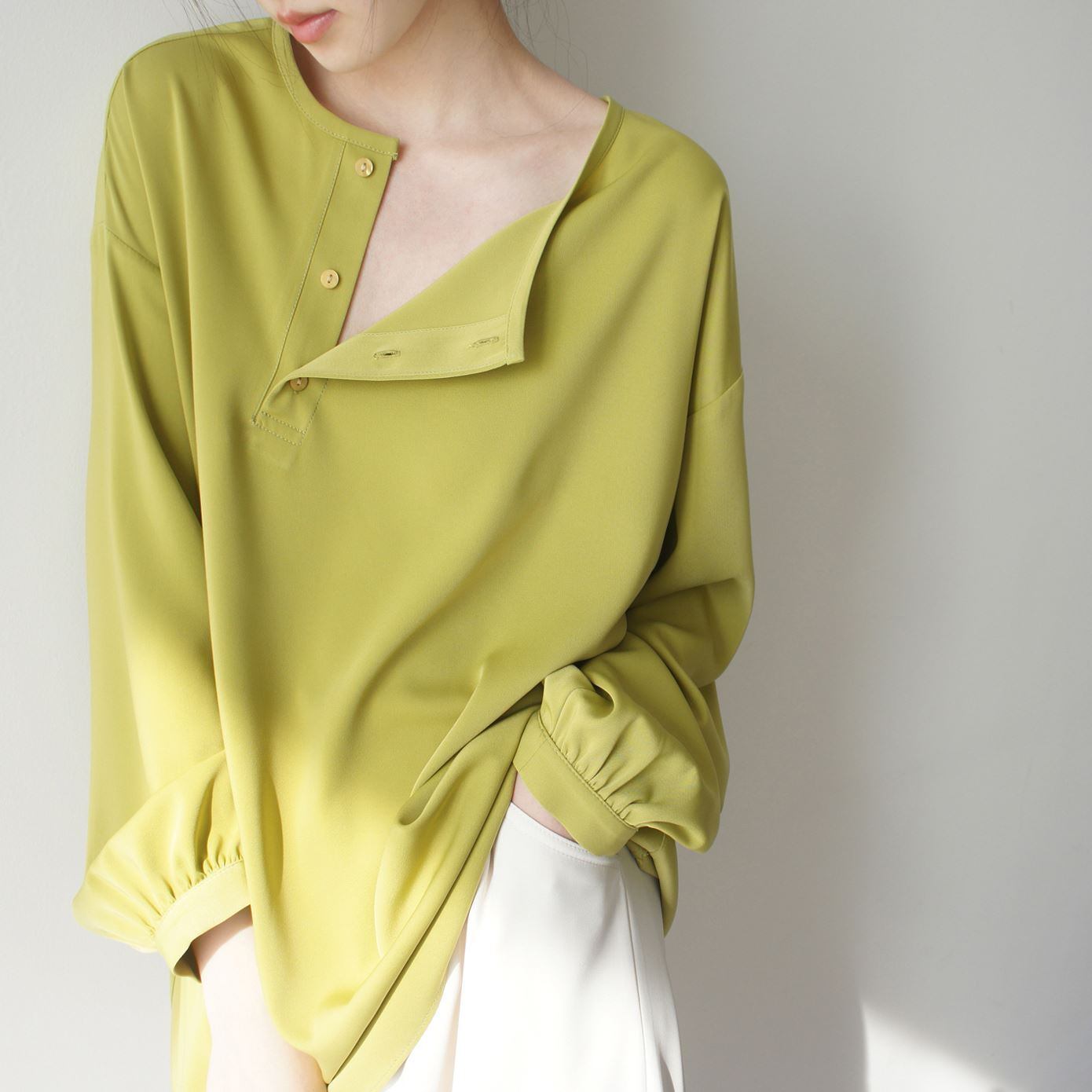 トップス レディース ブラウス プルオーバー 袖あり 長袖 ノーカラー バンドカラー ボリューム袖 バルーンスリーブ ぽわん袖 無地 レトロ フロントボタン ゆったり 大きいサイズ オーバーサイズ ドロップショルダー 体型カバー 着痩せ 薄手 大人可愛い かわいい カジュアル 韓国 シンプル ラフ おしゃれ 春 夏 秋 冬 オールシーズン シーズンレス 送料無料 お出かけ 通勤 オフィス デート 普段着 着回し ビジネス オフィスカジュアル 緑 グリーン S M 10代 20代 30代 40代 50代