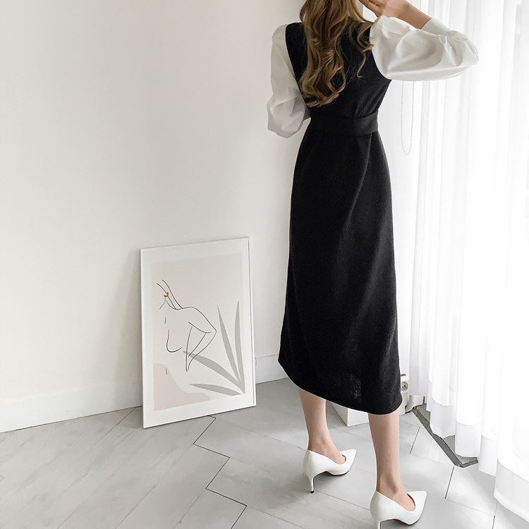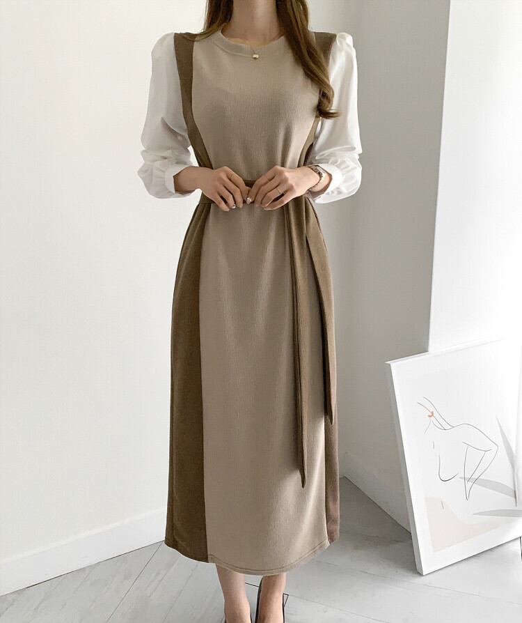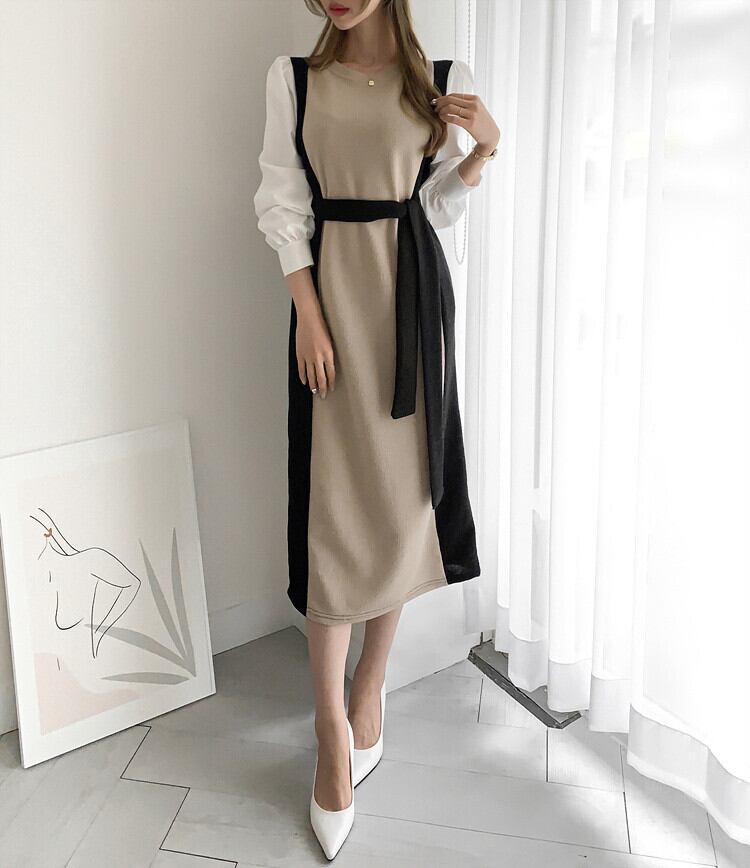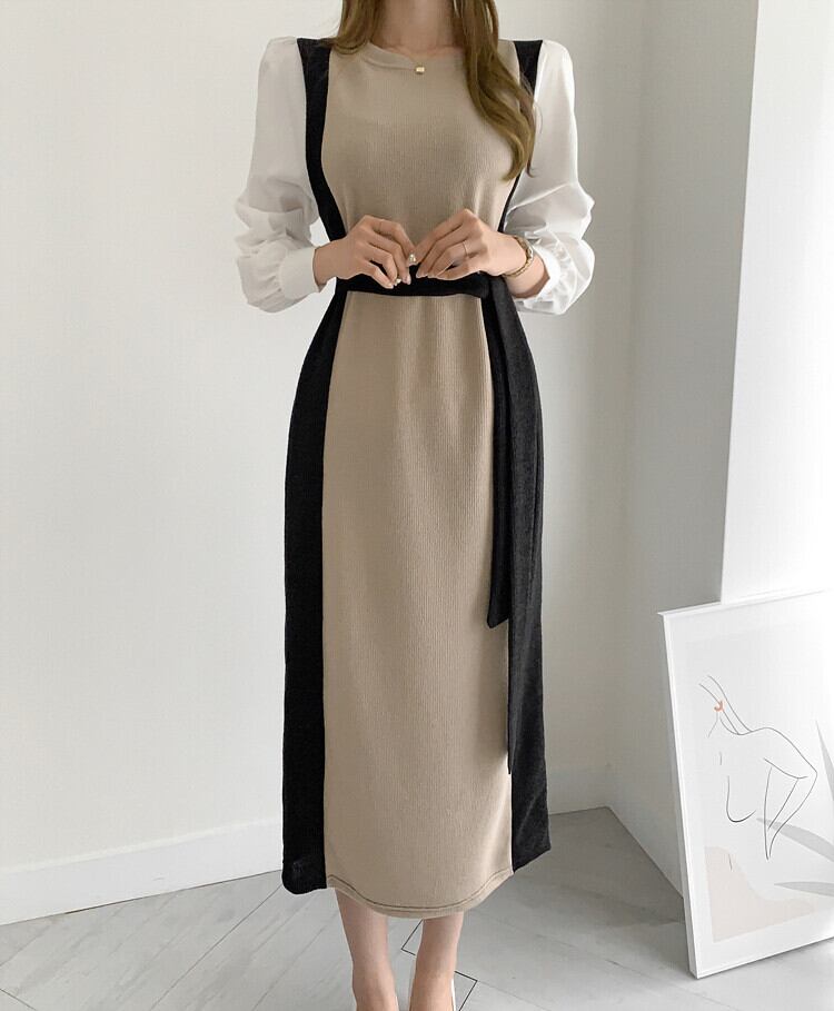ワンピース レディース ニットワンピース ドッキングワンピ ニット ミモレ丈 ロング丈 ラウンドネック 長袖 プルオーバー パフスリーブ ぽわん袖 無地 バイカラー 配色 レトロ ハイウエスト ウエストマーク ドッキング ゆったり 体型カバー 着痩せ セミフレア おしゃれ 大人 大人可愛い カジュアル 清楚 上品 韓国 きれいめ 春 秋 冬 シーズンレス 送料無料 お出かけ 通勤 オフィス デート 普段着 着回し 黒 ブラック 茶色 ブラウン 10代 20代 30代 40代 フリーサイズ
