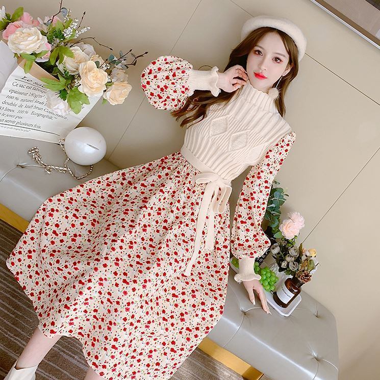 ワンピース レディース ニットワンピース ドッキングワンピ フレアワンピース ニット 異素材 ミモレ丈 ハイネック 長袖 プルオーバー パフスリーブ ぽわん袖 バイカラー 花柄 小花柄 レトロ ウエストマーク トレンド ドッキング ひらひら ゆったり 大きいサイズ 体型カバー 着痩せ おしゃれ 大人 かわいい 大人可愛い カジュアル 清楚 上品 ガーリー 韓国 キュート 春 秋 冬 送料無料 お出かけ デート 普段着 着回し レッド ブルー ベージュ 10代 20代 30代 S M L XL