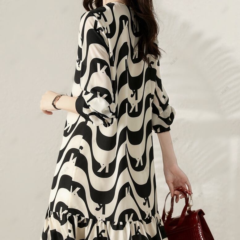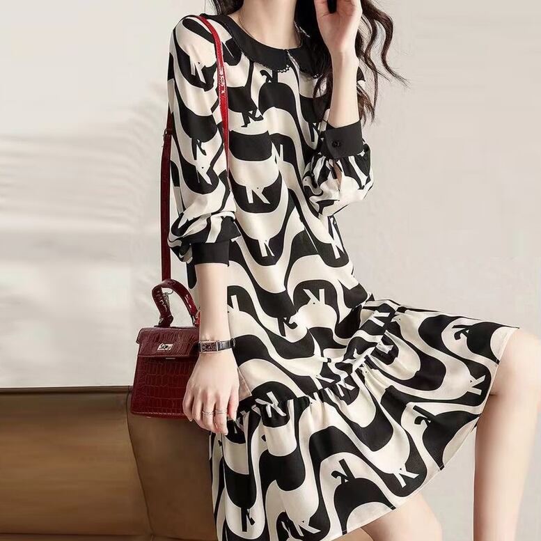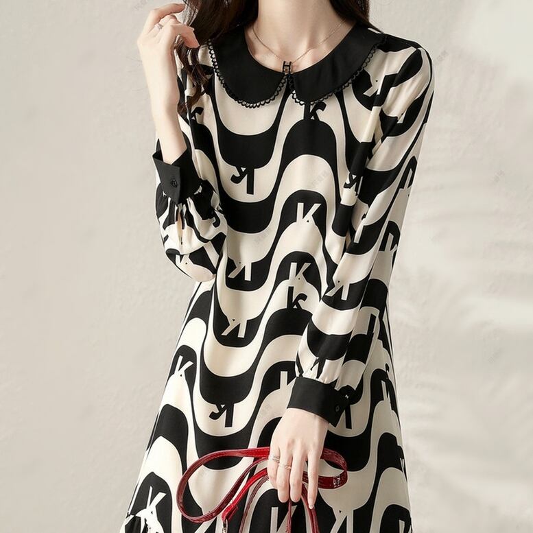 ワンピース レディース プリントワンピース 裾フリル バイカラー ドレス フレア ロング丈 ひざ下丈 長袖 襟付き 丸襟 幾何学柄 シフォン 黒 ブラック 大人可愛い きれいめ 上品 アジアン ルーズ ガーリー エレガント フォーマル フェミニン 春 夏 秋 冬 二次会 OL 学生 オフィス ビジネス 通勤 通学 デート お出かけ 女子会 パーティー イベント 休日 アウトドア オーバーサイズ ゆったり 体型カバー 美脚 定番 トレンド インスタ映え 送料無料