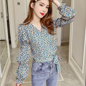 トップス レディース シャツ ブラウス プルオーバー シフォン ショート ショート丈 クロップド 長袖 Vネック パフスリーブ 花柄 総柄 レトロ ベーシック ウエストマーク トレンド ゆったり 大きいサイズ オーバーサイズ 体型カバー 着痩せ 薄手 大人可愛い かわいい カジュアル フェミニン ガーリー 韓国 キュート おしゃれ お洒落 春 夏 秋 冬 送料無料 お出かけ デート 女子会 普段着 普段使い 着回し イベント 休日 青 ブルー S M L XL 2XL 10代 20代 30代 40代