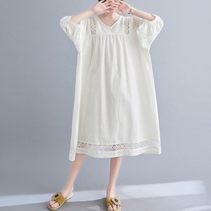 ワンピース レディース フレアワンピース レース リネン コットン 膝下 ミモレ丈 Vネック 七分袖 袖あり プルオーバー ボリューム袖 バルーンスリーブ ぽわん袖 無地 レトロ トレンド ゆったり 大きいサイズ オーバーサイズ フレア 体型カバー 着痩せ シースルー 透け感 ギャザー ルーズ おしゃれ 大人可愛い カジュアル 清楚 ガーリー 韓国 キュート シンプル 春 夏 秋 送料無料 普段着 普段使い 着回し ホワイト ブラック 10代 20代 30代 40代 L XL 2XL 3XL