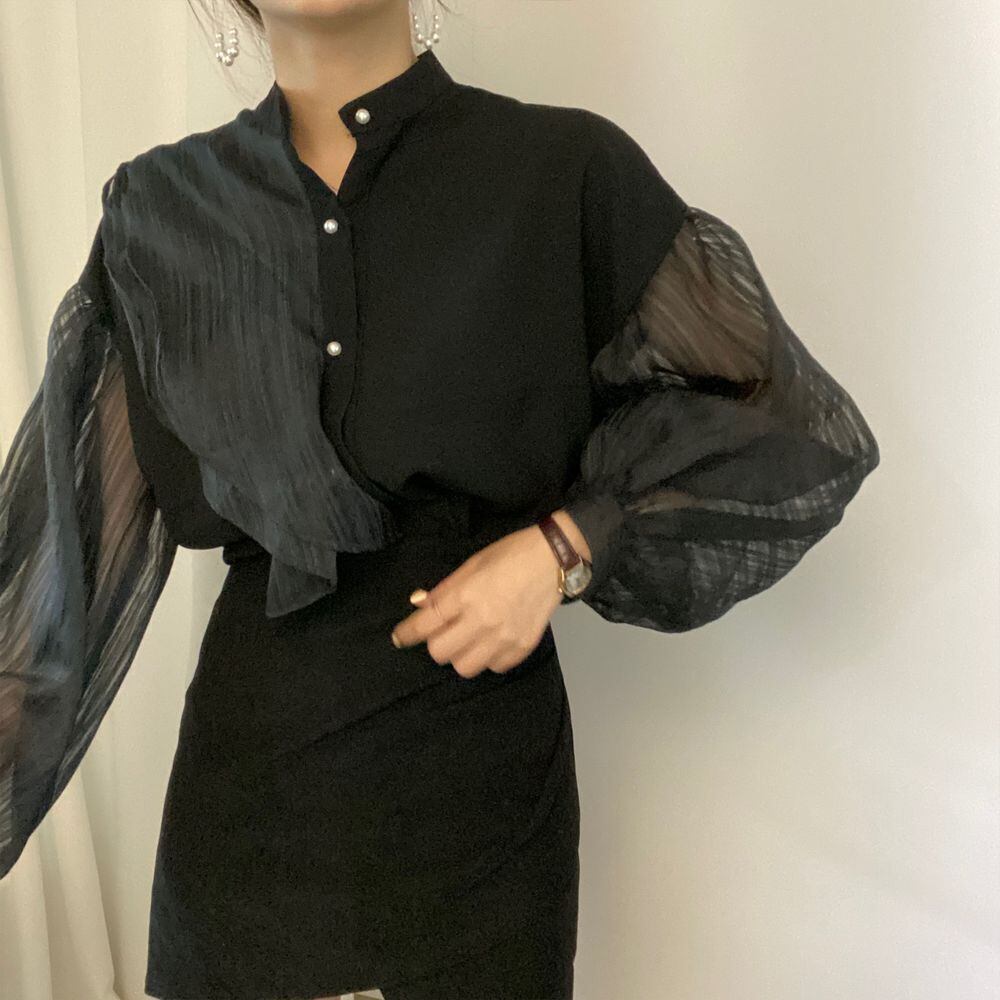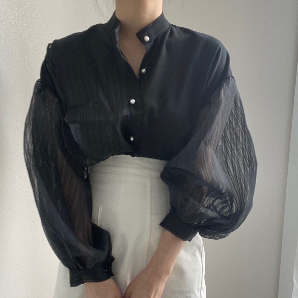 トップス レディース シャツ ブラウス 長袖 バンドカラー ボリューム袖 バルーンスリーブ ぽわん袖 無地 ストライプ レトロ パールボタン フロントボタン ゆったり オーバーサイズ アシンメトリー 体型カバー 着痩せ 薄手 シースルー 透け感 大人可愛い カジュアル 韓国 キュート おしゃれ 上品 清楚 お洒落 春 夏 秋 シーズンレス 送料無料 お出かけ 通勤 オフィス デート 普段使い 着回し オフィスカジュアル 白 ホワイト 黒 ブラック フリーサイズ 10代 20代 30代 40代