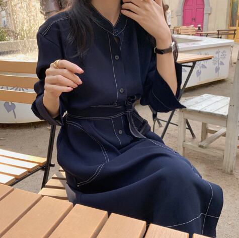 ワンピース レディース ミモレ丈ワンピース ミモレ丈 長袖ワンピース 長袖 ロングスリーブ 袖あり ハイネック スタンドカラー ステッチ シンプル 無地 Aライン ウエストマーク クラシカル レトロ エレガント 上品 おしゃれ 大人 大人カジュアル 羽織り レイヤード 着回し ネイビー 紺 ブラウン 茶 シャツワンピース シャツドレス S M L XL 20代 30代 40代 50代 お出かけ デート デイリー 普段使い お散歩 旅行 女子会 女子旅 ママコーデ 高見え 春 秋 送料無料