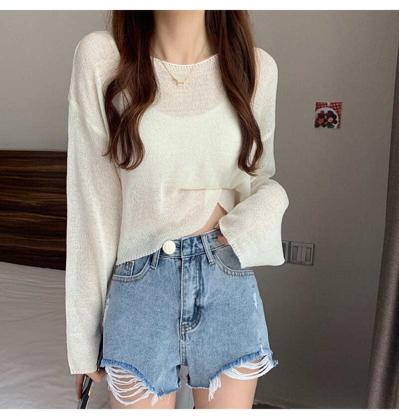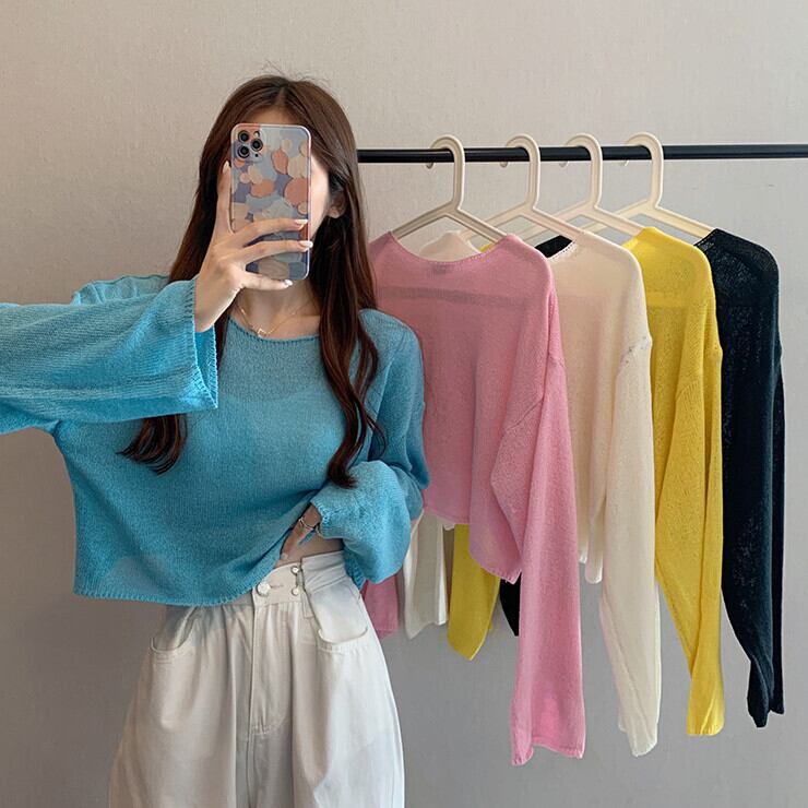 トップス レディース ニット サマーニット セーター ラウンドネック プルオーバー 薄手 長袖 襟なし 袖あり フレアスリーブ ショート ショート丈 S M L XL ブルー ピンク ホワイト イエロー ブラック 夏 ラフ ゆる ゆったり ルーズ 楽ちん 無地 シンプル カジュアル ファッション お洒落 おしゃれ 可愛い かわいい 大人 大人っぽ 女っぽ 大人可愛い 大人女子 フェミニン ガーリー 女性用 お出かけ デート ショッピング ランチ 女子会 旅行 休日 通勤 通学 韓国系 オルチャン 送料無料