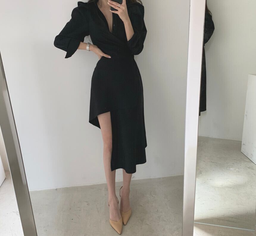 ワンピース レディース シャツ シャツワンピース ワンピドレス ショート ショート丈 膝上 袖あり 長袖 Vネック 襟付き デコルテ デコルテ開き スリム タイト 細身 アシンメトリー くしゅくしゅ ハイウエスト 薄手 甘辛MIX かわいい 可愛い 大人 大人可愛い 大人女子 きれいめ 上品 おしゃれ お洒落 クール かっこいい セクシー キュート シンプル カジュアル こなれ感 ラフ デート お出かけ 公園デビュー 女子会 休日 旅行 イベント 韓国 オルチャン 美脚 脚長 モテ S M L 送料無料