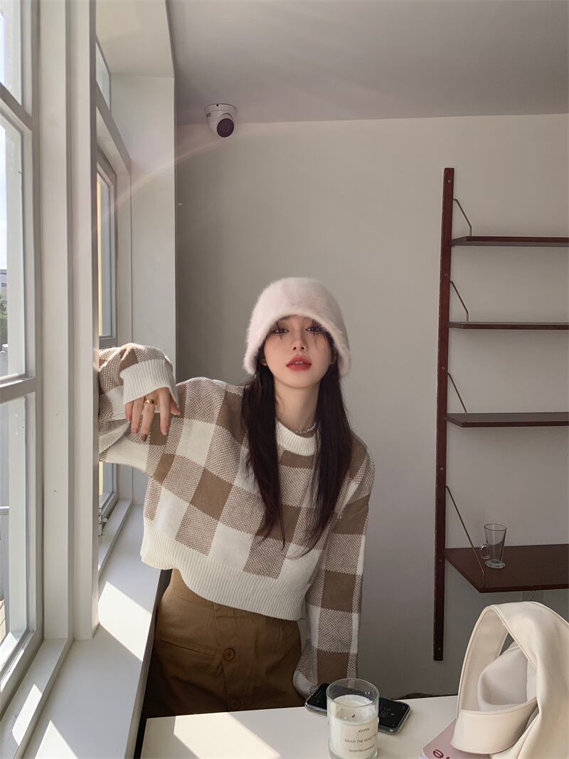 トップス レディース ニットソー ニット セーター プルオーバー ショート ショート丈 袖あり 長袖 萌袖 Uネック ラウンドネック 襟なし 厚手 かわいい 可愛い 大人 大人可愛い 大人女子 きれいめ 上品 おしゃれ お洒落 レトロ シンプル カジュアル こなれ感 ラフ ルーズ チェック柄 秋 冬 10代 20代 30代 女性用 通勤 通学 学生 デート お出かけ 公園デビュー 女子会 休日 イベント 普段使い 韓国 オルチャン ファッション S M L XL ゆる ゆったり ブルー ブラウン 送料無料
