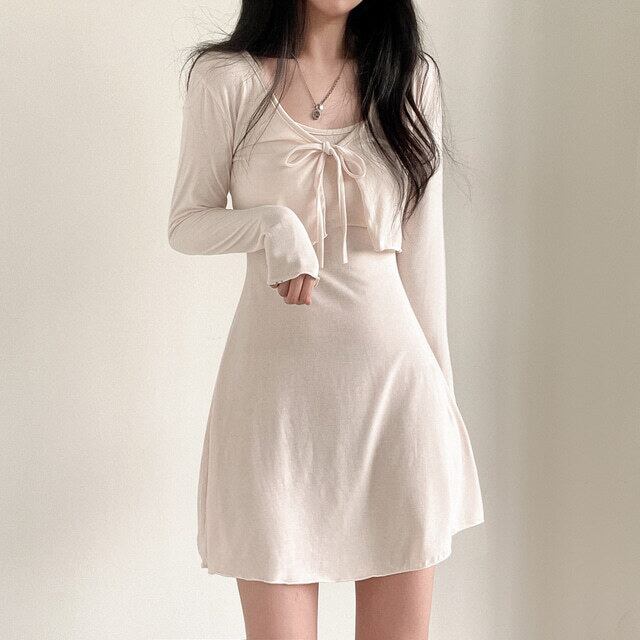 ワンピース レディース キャミソール ワンピドレス キャミワンピ カーディガン ミニ ミニ丈 ショート ショート丈 袖あり 長袖 襟なし Uネック ラウンドネック 薄手 2点セット お得 かわいい 大人 大人可愛い 大人女子 きれいめ 上品 おしゃれ お洒落 ガーリー セクシー キュート シンプル カジュアル こなれ感 無地 デート お出かけ 公園デビュー 女子会 休日 旅行 イベント 韓国系 オルチャン 楽ちん ファッション スタイル コーデ トレンド ワンサイズ ブラック ホワイト 黒 白 送料無料