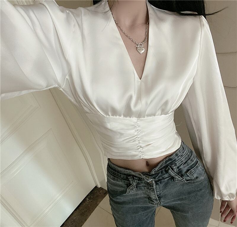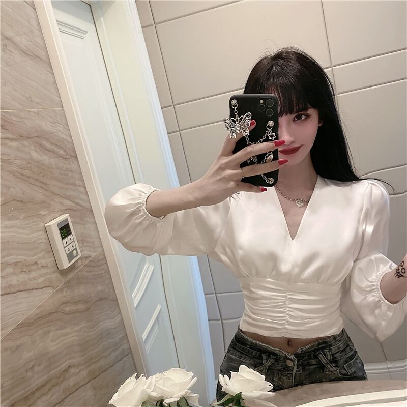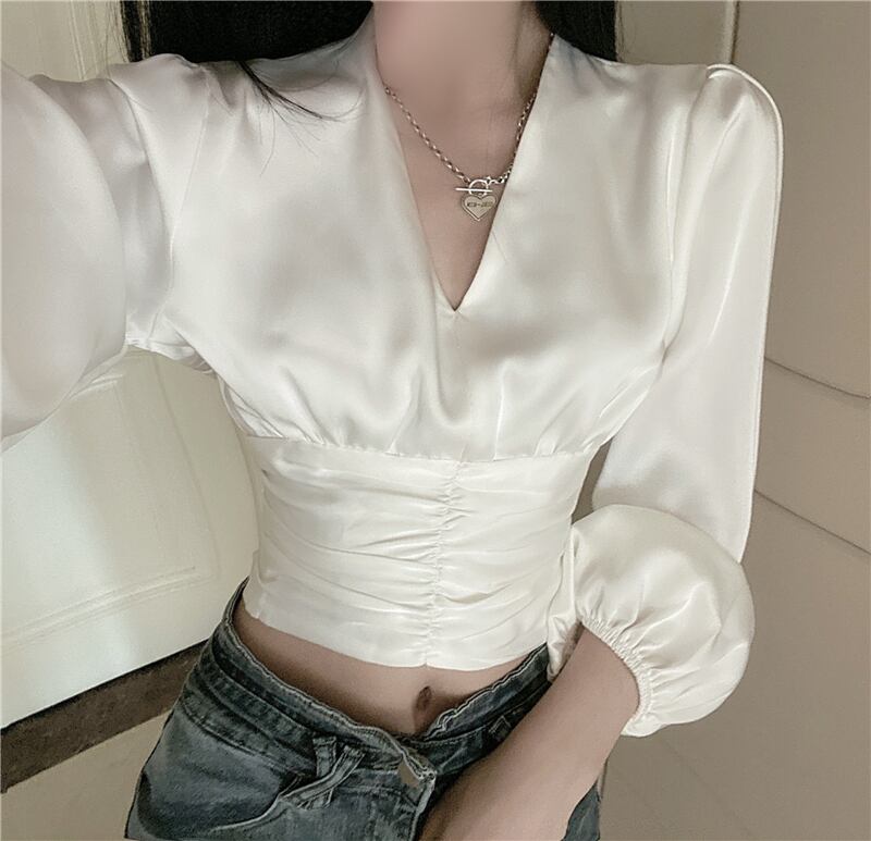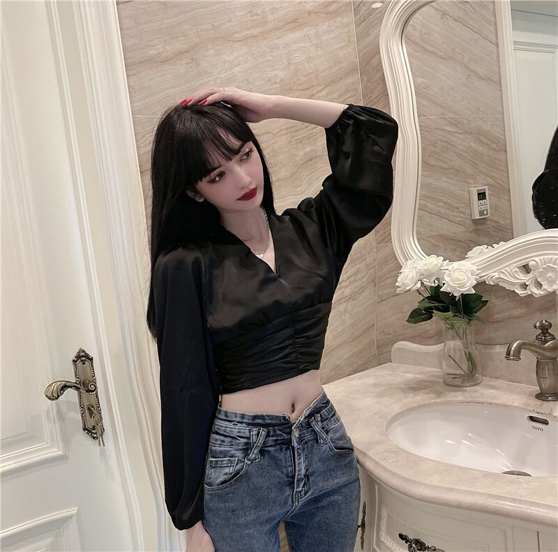トップス レディース プルオーバー シャツ ブラウス ショート ショート丈 袖あり 長袖 パフスリーブ ボリューム袖 襟なし Vネック スリム 細身 ハイウエスト 薄手 かわいい 可愛い 大人 大人可愛い 大人女子 きれいめ 上品 おしゃれ お洒落 クール ガーリー セクシー キュート シンプル カジュアル こなれ感 ラフ 無地 デート お出かけ 公園デビュー 女子会 休日 旅行 韓国 韓国系 オルチャン モテ ファッション コーデ スタイル トレンド S M ゆる ホワイト ブラック 白 黒 送料無料