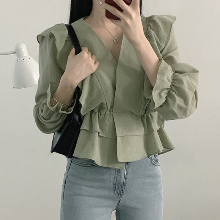 トップス レディース プルオーバー シャツ ブラウス ショート ショート丈 袖あり 長袖 パフスリーブ ボリューム袖 襟なし Vネック フリル ハイウエスト 薄手 かわいい 可愛い 大人 大人可愛い 大人女子 きれいめ 上品 おしゃれ お洒落 クール ガーリー セクシー キュート シンプル カジュアル こなれ感 ラフ 無地 デート お出かけ 公園デビュー 女子会 休日 旅行 韓国系 オルチャン モテ ファッション スタイル トレンド コーデ S M L XL ゆる ゆったり グリーン アイボリー 送料無料