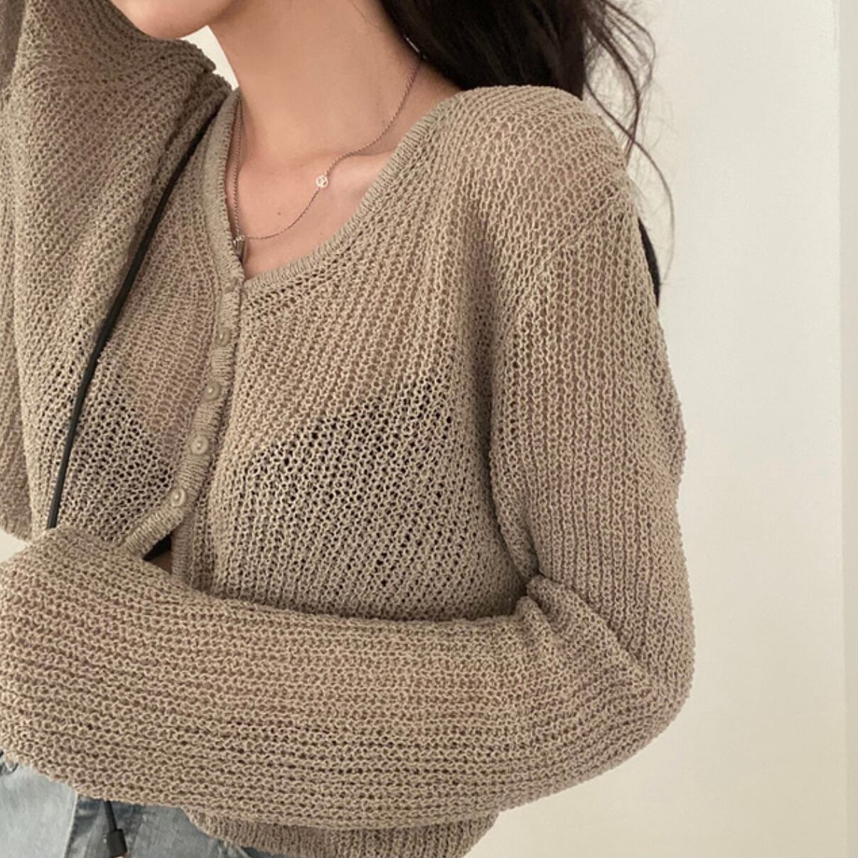 ニット素材の透け感ありのカーディガン。