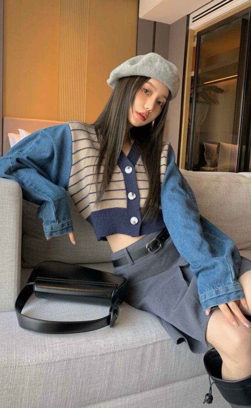 袖元はデニム、フロント部分はニットと異素材ミックス〇