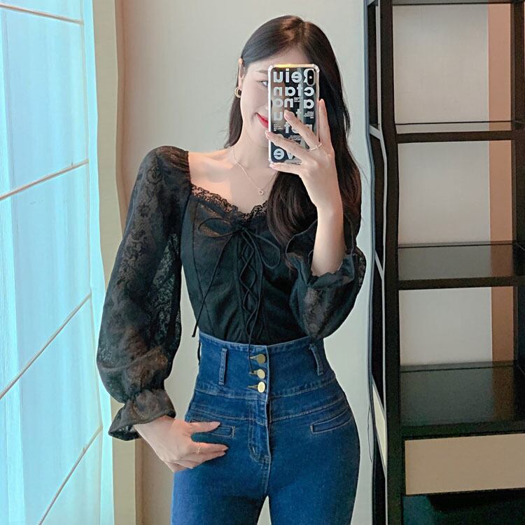 トップス レディース プルオーバー シャツ ブラウス ショート ショート丈 袖あり 長袖 パフスリーブ シャーリングパフ ボリューム袖 襟なし Vネック リボン フリル レース ハイウエスト 薄手 かわいい 可愛い 大人 大人可愛い 大人女子 きれいめ 上品 おしゃれ お洒落 クール ガーリー セクシー キュート シンプル カジュアル こなれ感 ラフ 無地 デート お出かけ 公園デビュー 女子会 休日 旅行 韓国 韓国系 オルチャン モテ ファッション スタイル ワンサイズ ブラック ホワイト 送料無料