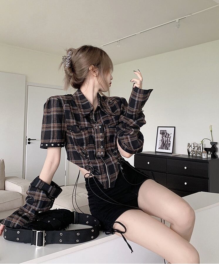 トップス レディース シャツ 短丈シャツ 変形シャツ 肌見せブラウス ミニ丈 クロップド 長袖 Vネック デコルテ 異素材ミックス ジップ アームウォーマー 襟 チェック かわいい お洒落 おしゃれ かっこいい 個性的 モード系 チェック柄 10代 20代 女性用 女の子 お出かけ メンズライク レースアップ 女子会 休日 普段着 イベント 着回し 重ね着 お揃い 双子 韓国 韓国系 オルチャン 主役級 オールシーズン ファッション コーデ スタイル モテ 穴あき サイズ 送料無料