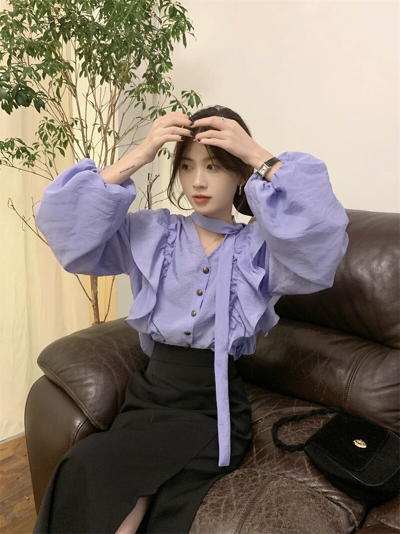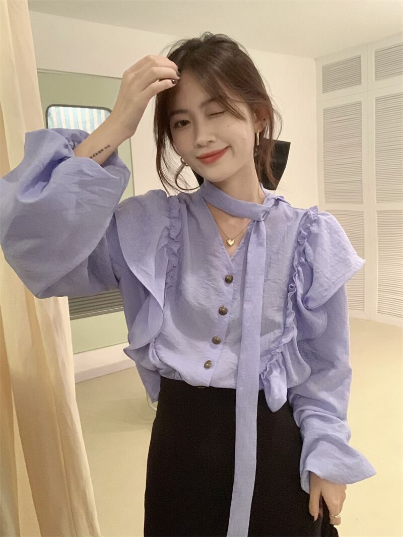 トップス レディース ブラウス フリル 袖あり 長袖 ボリューム袖 Vネック デコルテ リボン スカーフ ボタン かわいい 可愛い 大人 大人可愛い こなれ感 上品 大人女子 キュート ガーリー エレガント モテ 主役級 存在感 とろみ感 無地 ラベンダー オフィス ビジネス 学生 デート 10代 20代 女性用 お出かけ 公園 カフェ 女子会 普段使い 韓国 韓国系 ファッション コーデ スタイル インスタ映え おしゃれ お洒落 旅行 リゾート ホテル イベント パーティー オールシーズン 送料無料