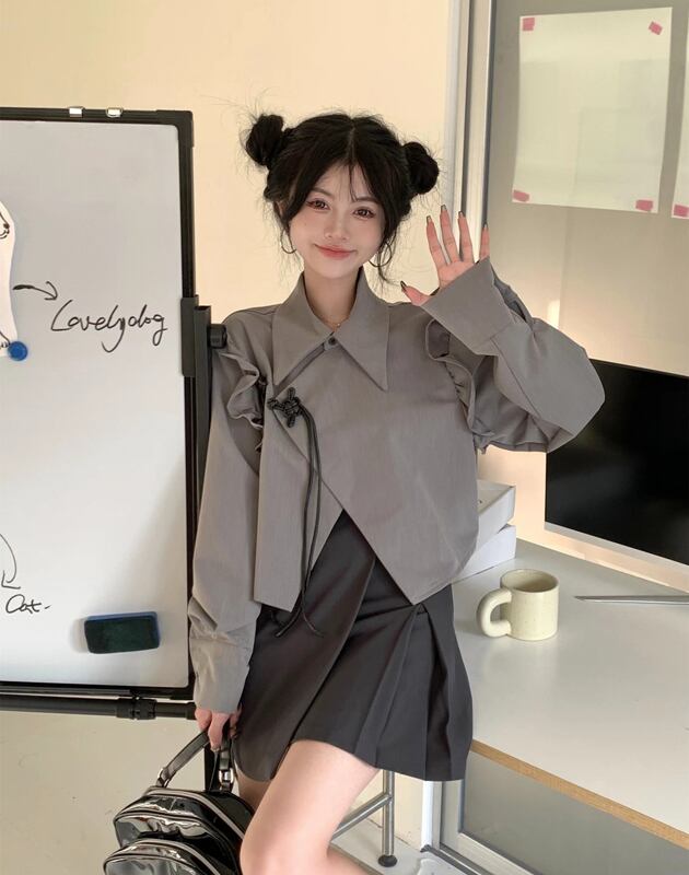 トップス レディース シャツ 袖あり 長袖 ショート丈 クロップド丈 クロップド ボタン 前開き フリル 休日 ワンポイント ミニ丈 襟付き 変形 大きめ袖 可愛い 個性的 大人可愛い こなれ感 上品 大人女子 エレガント モテ 主役級 存在感 学生 デート 10代 20代 女性用 お出かけ 公園 カフェ 女子会 普段使い 韓国 韓国系 ファッション コーデ スタイル インスタ映え おしゃれ お洒落 シンプル 無地 ホテル イベント パーティー レストラン 着回し お揃い 個性的 オルチャン 送料無料