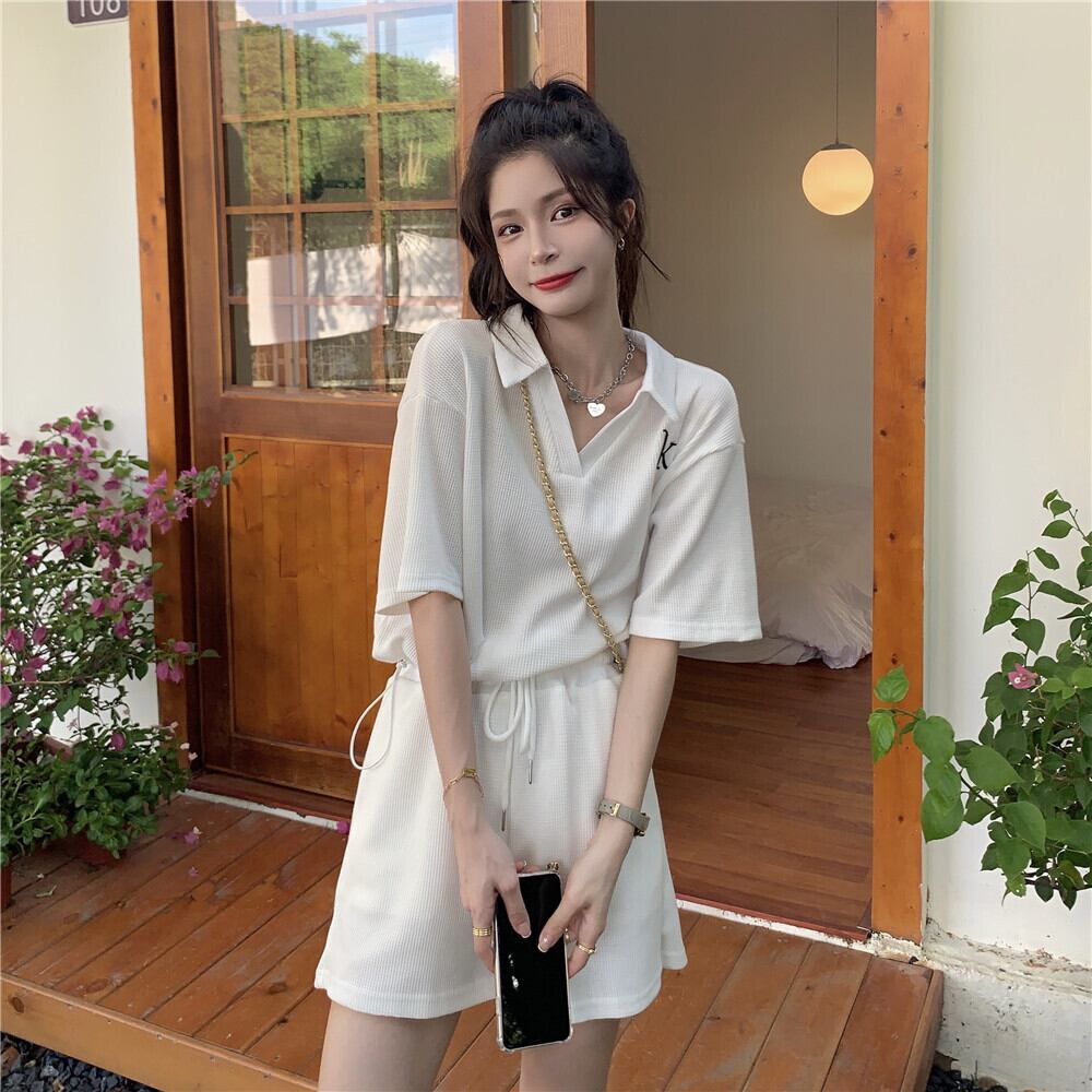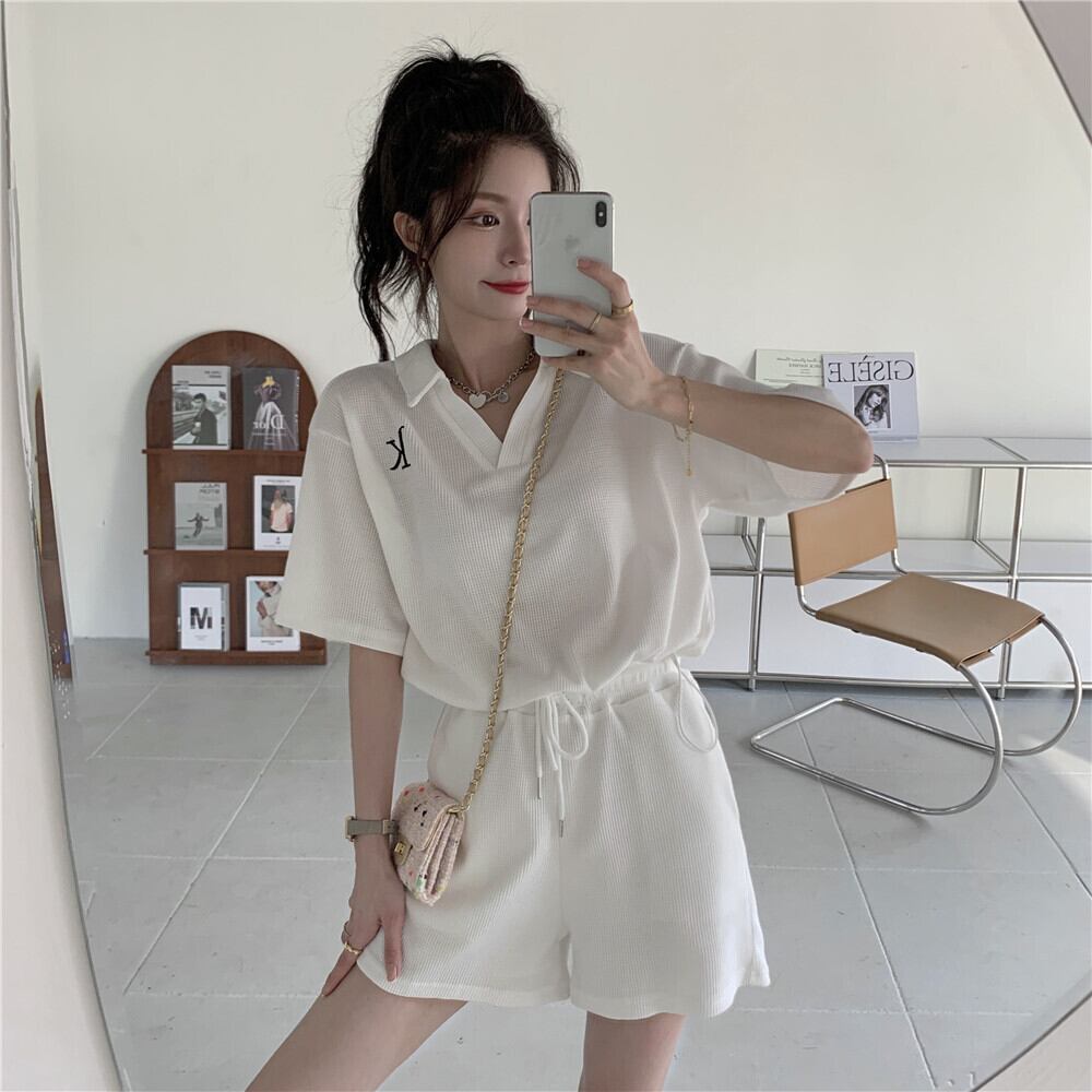 レディース セットアップ 上下セット スポーツウェア ルームウェア ブイネック 襟あり 半袖 春 夏 無地 ワンポイント かわいい 可愛い 大人 大人っぽ 大人可愛い 大人女子 上品 きれいめ キュート おしゃれ お洒落 女っぽ かっこいい クール スポーティー ルーズ シンプル カジュアル ファッション スタイル コーデ 体型カバー 普段使い 着回し 重ね着 ラフ ゆったり 楽ちん 個性的 スポーツ アウトドア S M L XL ホワイト 大人カラー モノトーン インスタ映え 2点セット 送料無料