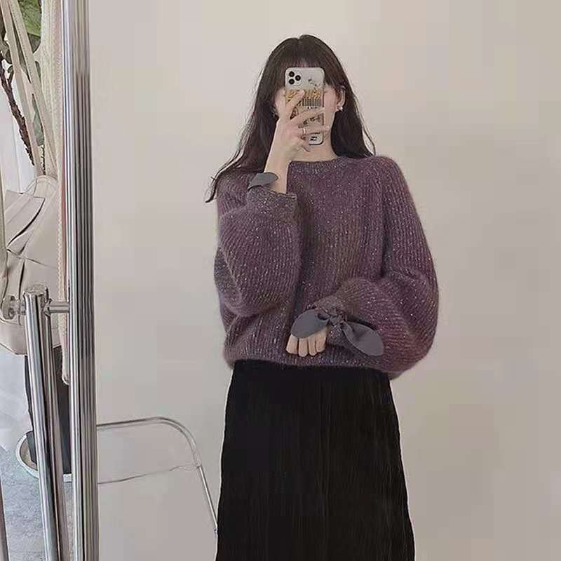 トップス レディース ニット プルオーバー オーバーシルエット 長袖 厚手 無地 ワンポイント リボン 袖 ビッグシルエット セーター 長袖 ドロップショルダー ラウンドネック ミディアム丈 大人可愛い きれいめ 上品 フォーマル ガーリー ルーズ マニッシュ 秋 冬 二次会 オフィス OL 通勤 学生 通学 デート お出かけ パーティー イベント 女子会 休日 アウトドア 体型カバー オーバーサイズ ゆったり モフモフ モテ パープル ブルー 大人カラー 秋カラー インスタ映え 送料無料