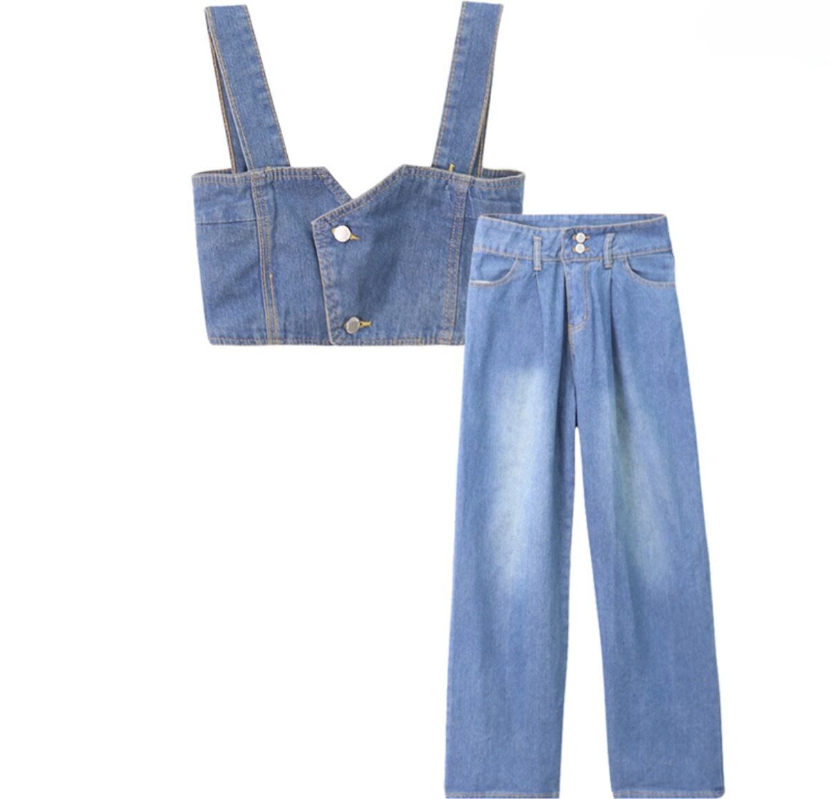 セットアップ レディース デニム ビスチェ パンツ ハイウエスト クロップド バギーパンツ ワイドパンツ ボタン ギャザー スタイルアップ デコルテ 重ね着 カジュアル シンプル ラフ おしゃれ お洒落 大人 大人女子 10代 20代 30代 女性用 学生 通学 お出かけ 女子会 休日 イベント 旅行 ホテル レストラン 普段使い 韓国 韓国風 オルチャン こなれ感 カフェ ファッション コーデ スタイル テーマパーク デート 休日 双子 主役級 着回し お揃い モテ 流行 インスタ映え お得 送料無料