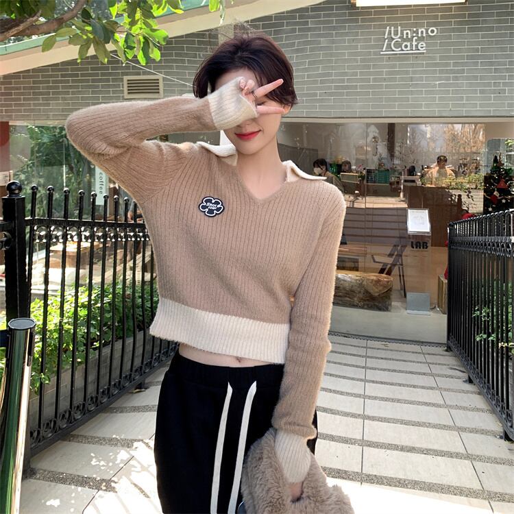 トップス レディース バイカラーニット クロップド クロップド丈 Vネック 襟あり 長袖 カジュアル シンプル クラシカル クラシック シック お洒落 おしゃれ オシャレ ハイセンス トレンドアイテム 着回し こなれ感 ぬけ感 デート 女子旅 旅行 女子会 女性用 女子 大人 大人可愛い きれいめ 通勤 通学 学生 春 秋 冬 10代 20代 30代 ブラック モカ S M L 大人カラー 秋カラー インスタ映え モテ ふわふわ もこもこ 韓国系 オルチャン 韓国ファッション 送料無料
