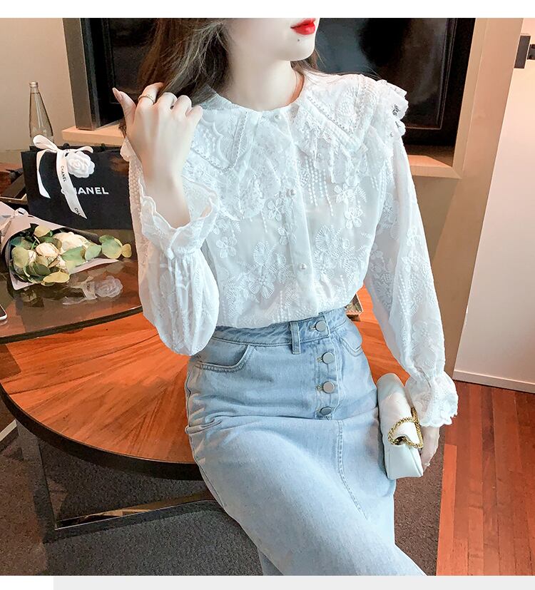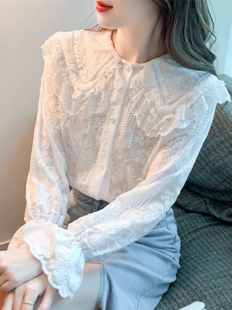 トップス レディース シャツ ビッグカラー ブラウス 白シャツ 白トップス プルオーバー 袖あり 長袖 ボリューム袖 パフスリーブ 襟付き ビッグ襟 刺繍 フリル 透け感 薄手 かわいい 可愛い 大人可愛い きれいめ シンプル カジュアル 大人 上品 おしゃれ お洒落 レトロ 大人女子 こなれ感 ラブリー キュート ガーリー 個性的 無地 春 夏 秋 女性用 オフィス 通勤 OL 通学 学生 デート お出かけ 女子会 休日 パーティー イベント 旅行 着回し 普段使い 重ね着 お揃い 韓国 送料無料