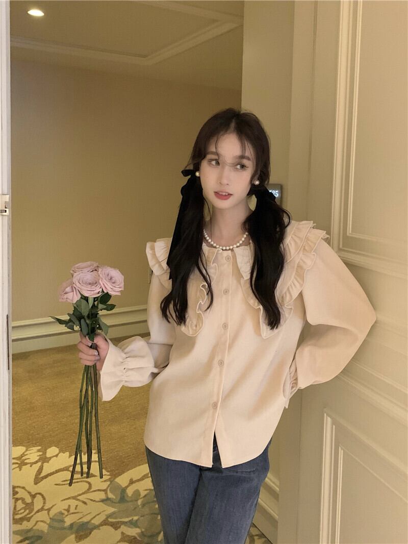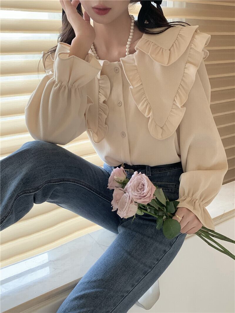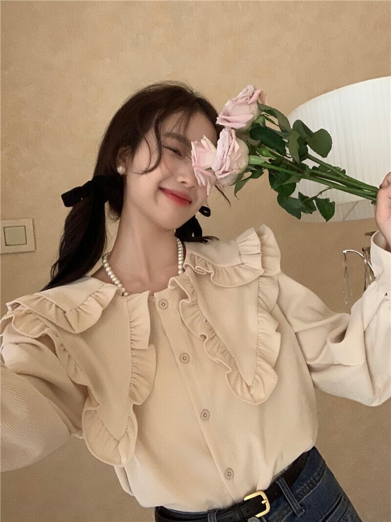トップス レディース シャツ ブラウス ショート丈 長袖 袖あり ラウンドネック 襟付き ビッグ襟 フリル 前開き 薄手 かわいい 大人可愛い シンプル カジュアル 上品 おしゃれ お洒落 レトロ 大人女子 こなれ感 ラフ ラブリー キュート ガーリー ルーズ 個性的 無地 10代 20代 デート お出かけ 女子会 休日 旅行 イベント 着回し 普段使い 重ね着 韓国 韓国系 オルチャン ファッション コーデ スタイル モテ 楽ちん フリーサイズ ゆる ゆったり アーミーイエロー アプリコット 送料無料
