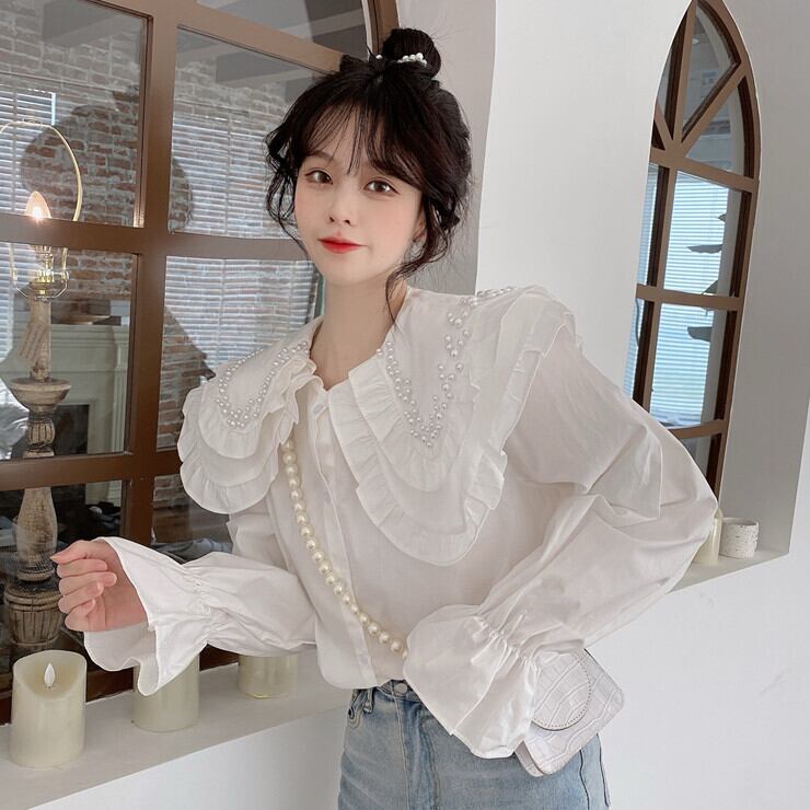 トップス レディース シャツ ブラウス 白トップス 白シャツ 長袖 パフスリーブ 襟付き ビッグ襟 フリル 前開き 薄手 かわいい 大人可愛い シンプル カジュアル 上品 おしゃれ お洒落 レトロ 大人女子 こなれ感 ラフ ラブリー キュート ガーリー ルーズ 個性的 無地 春 10代 20代 デート お出かけ 女子会 休日 旅行 イベント 着回し 普段使い 重ね着 韓国 韓国系 オルチャン ファッション コーデ スタイル モテ 楽ちん 体型カバー ゆる ゆったり 大きめ フリーサイズ ホワイト 送料無料