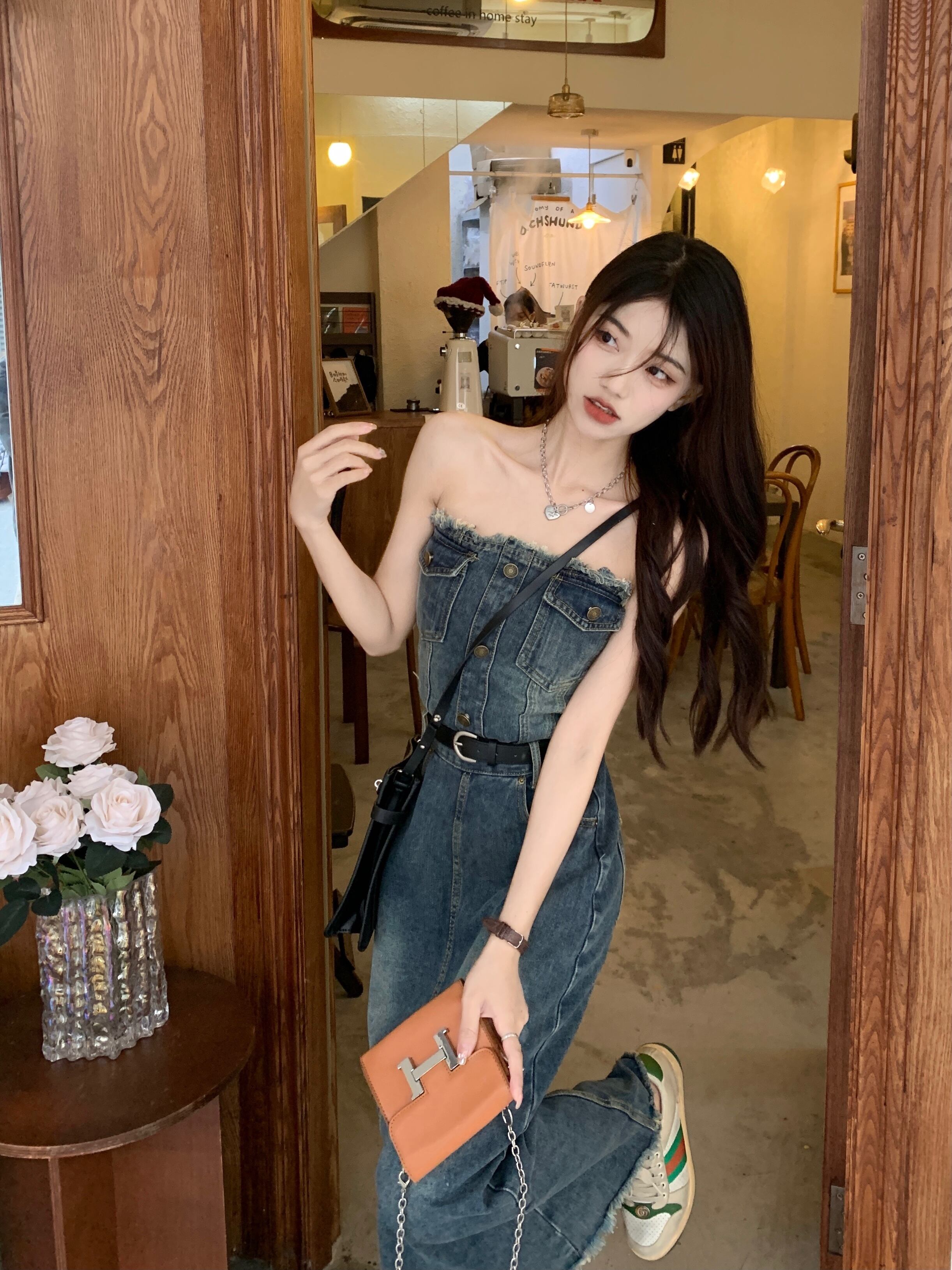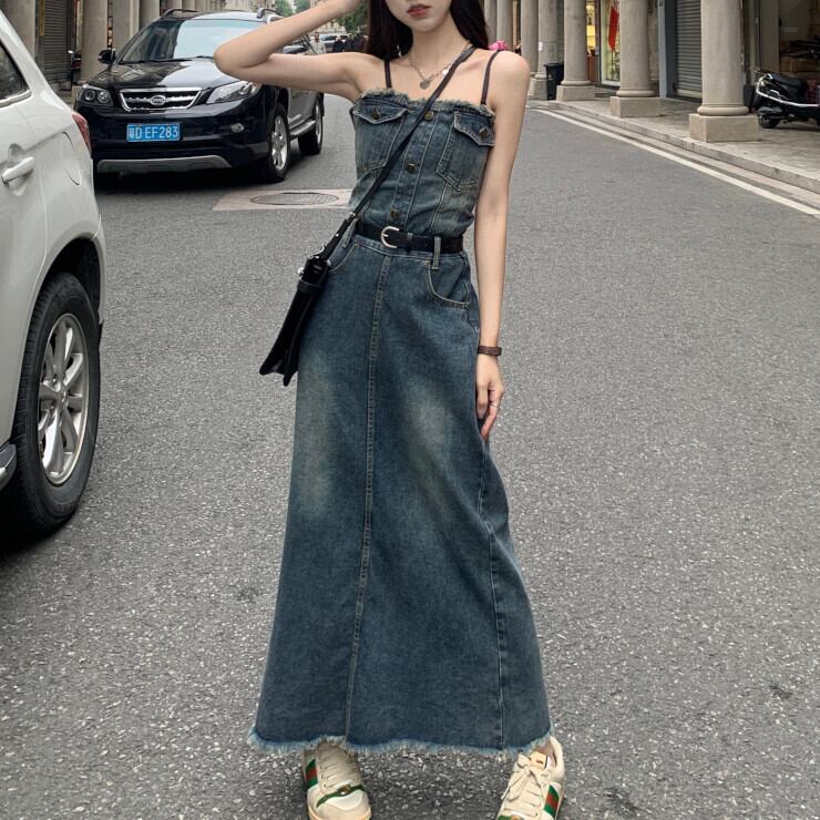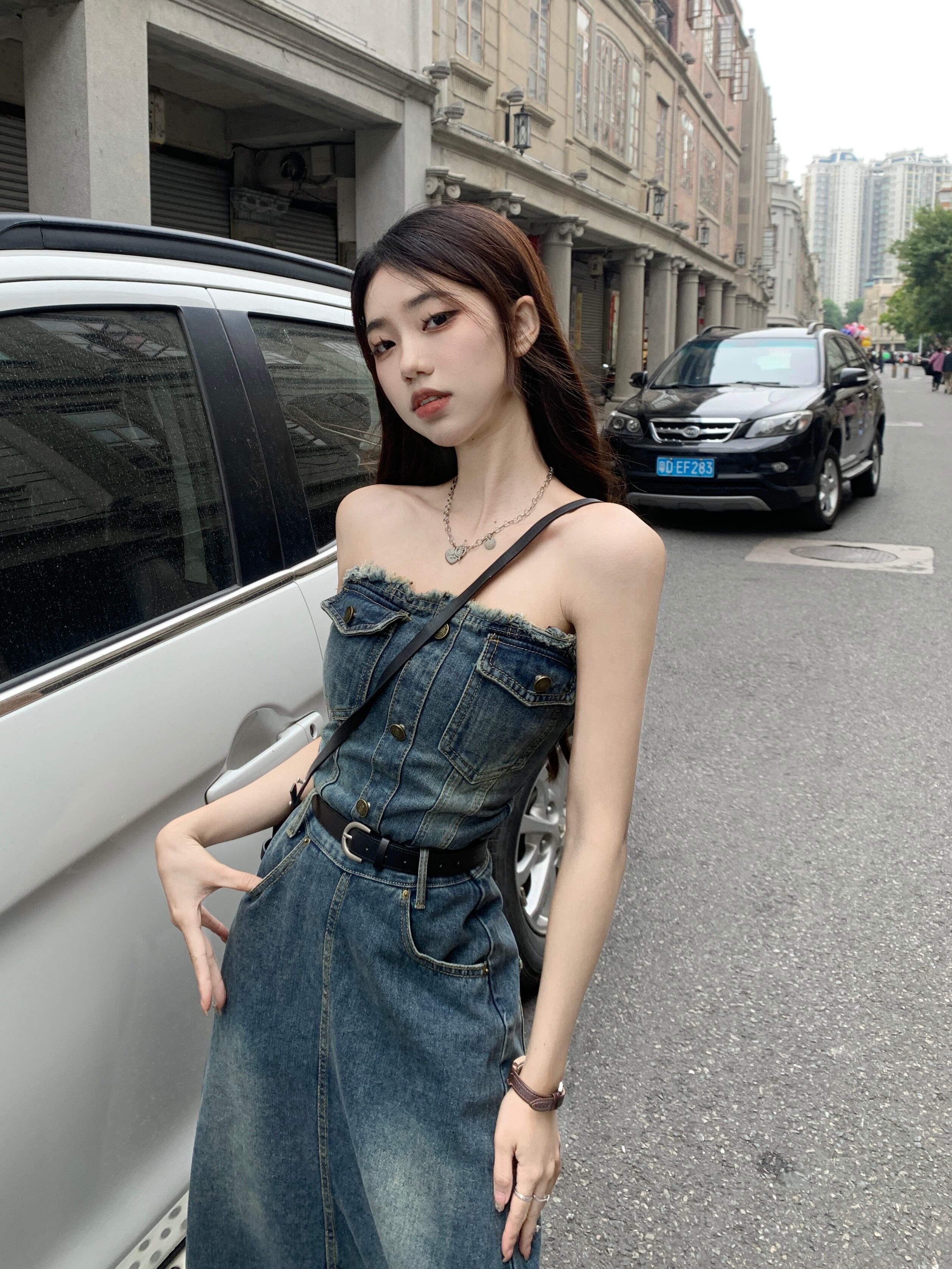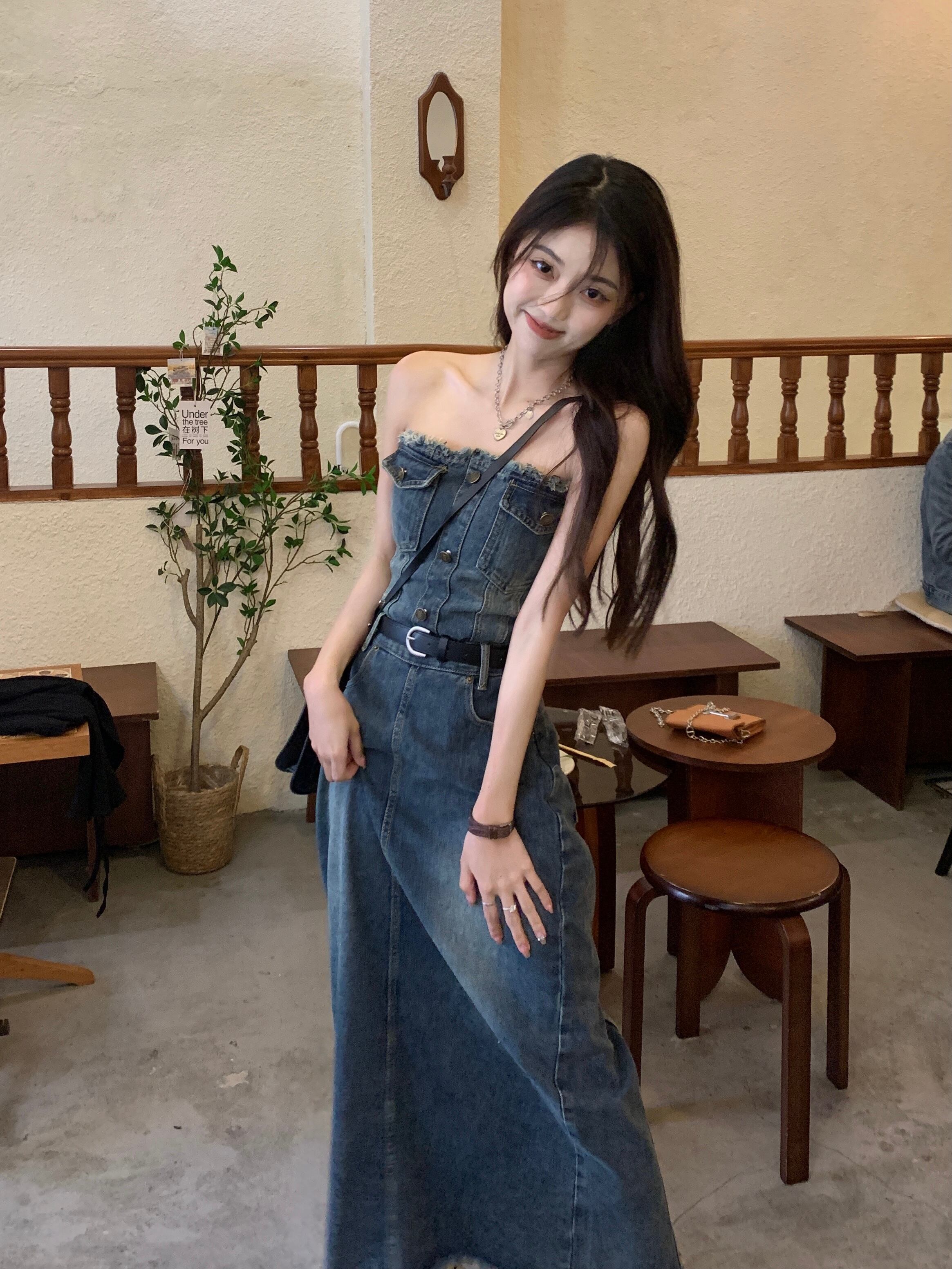 ワンピース レディース スカート プルオーバー デニムスカート ロング丈 マキシ丈 ミディアム丈 チューブトップ 袖なし ノースリーブ 襟なし レースアップ Aライン スリム 細身 ハイウエスト ベルト デニム ブルーデニム かわいい 大人可愛い きれいめ シンプル カジュアル 大人 上品 おしゃれ お洒落 大人女子 キュート かっこいい クール こなれ感 無地 夏 10代 20代 デート お出かけ 女子会 イベント 着回し 普段使い 韓国 韓国系 オルチャン ファッション コーデ スタイル S M L